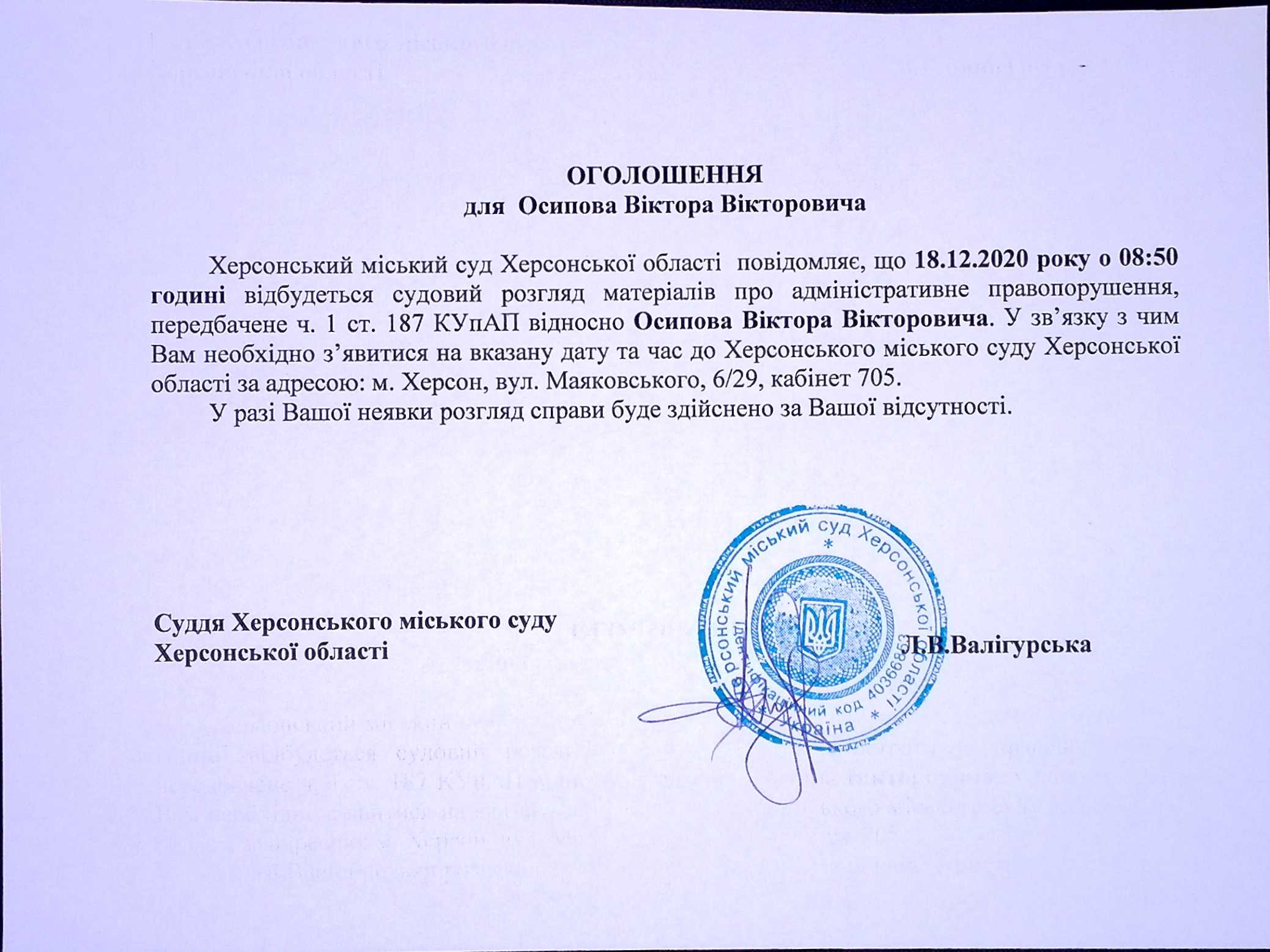 ОГОЛОШЕННЯ для Осипова Віктора Вікторовича