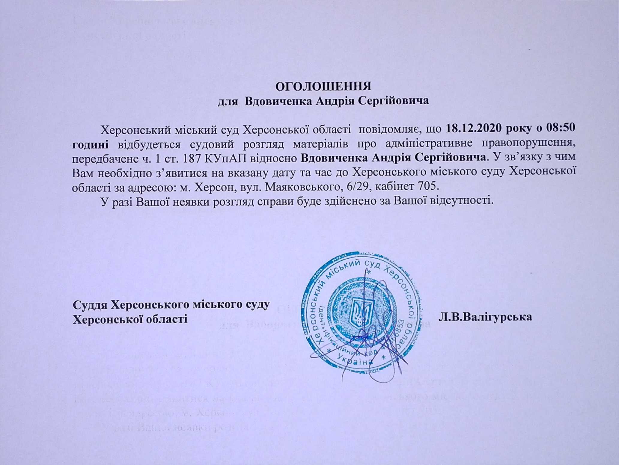 ОГОЛОШЕННЯ для Вдовиченка Андрія Сергійовича