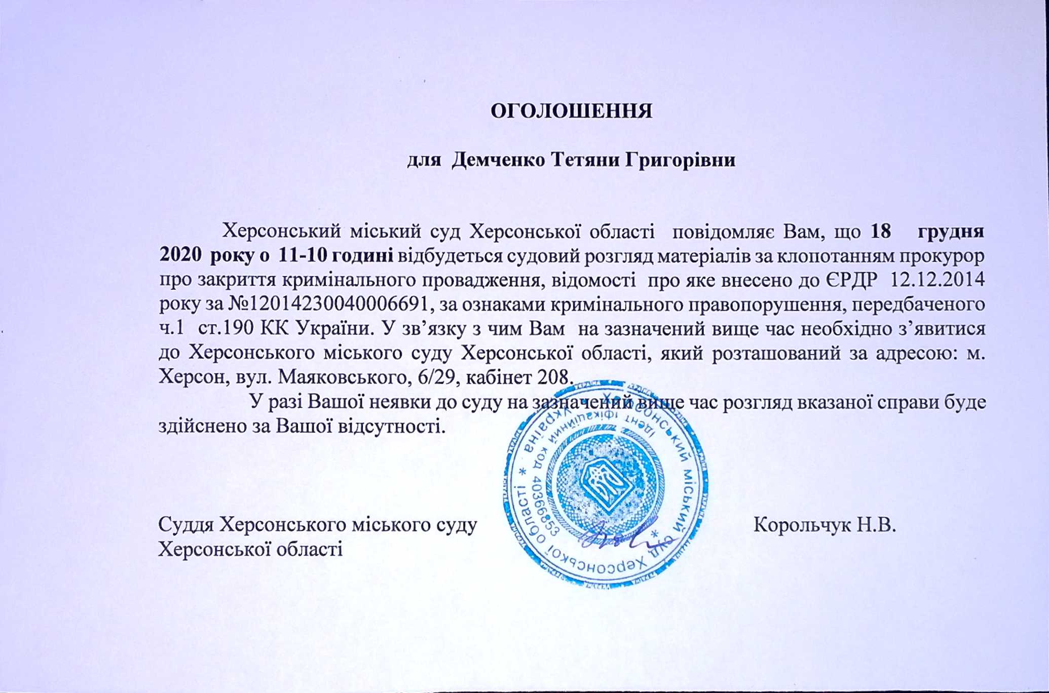 ОГОЛОШЕННЯ для Демченко Тетяни Григорівни