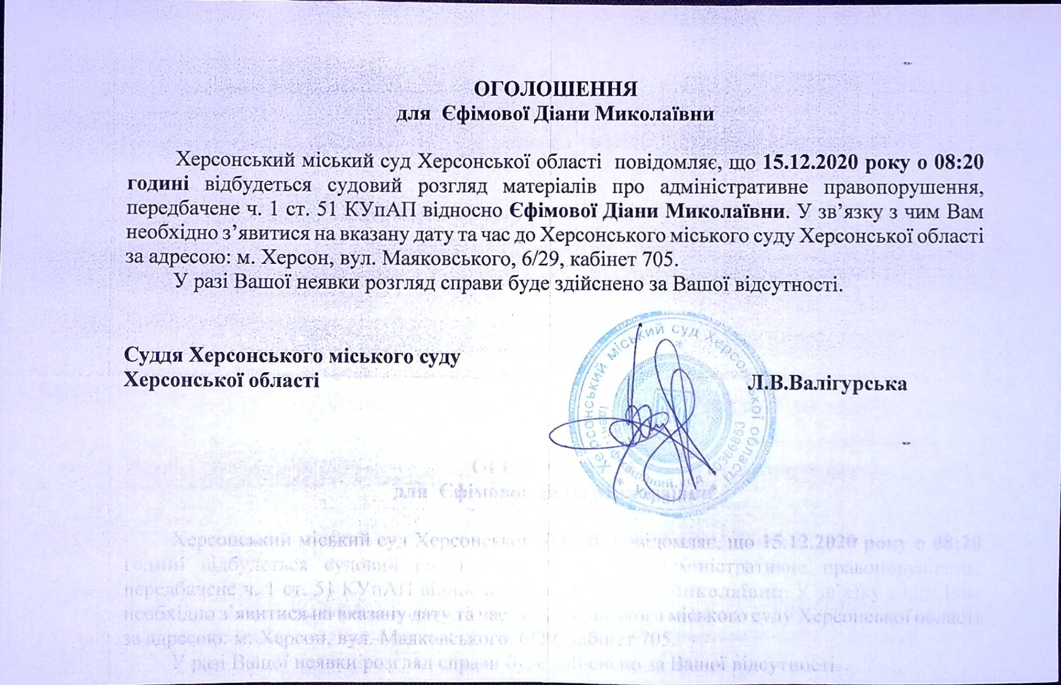 ОГОЛОШЕННЯ для Єфімової Діани Миколаївни
