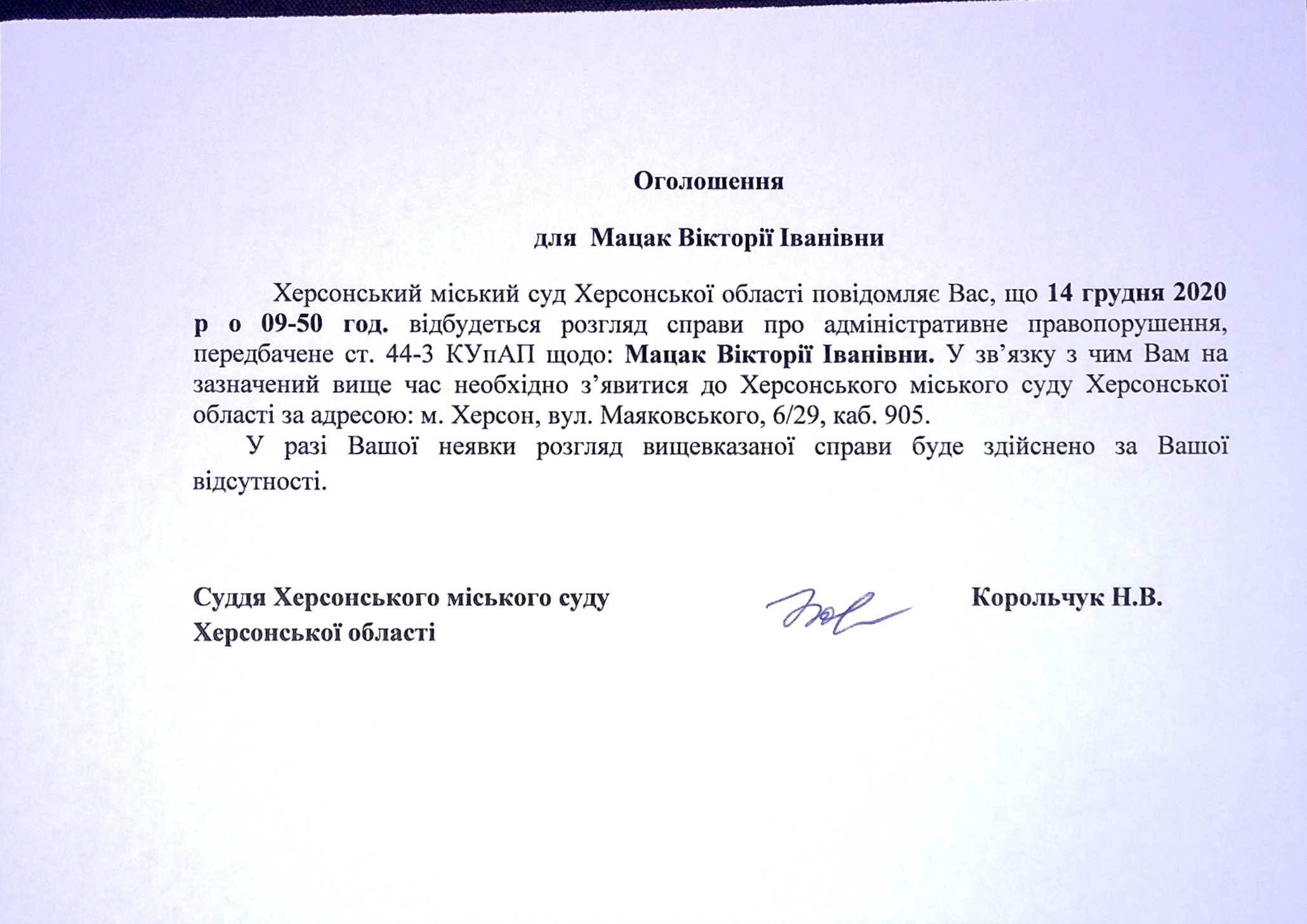 ОГОЛОШЕННЯ для Мацак Вікторії Іванівни