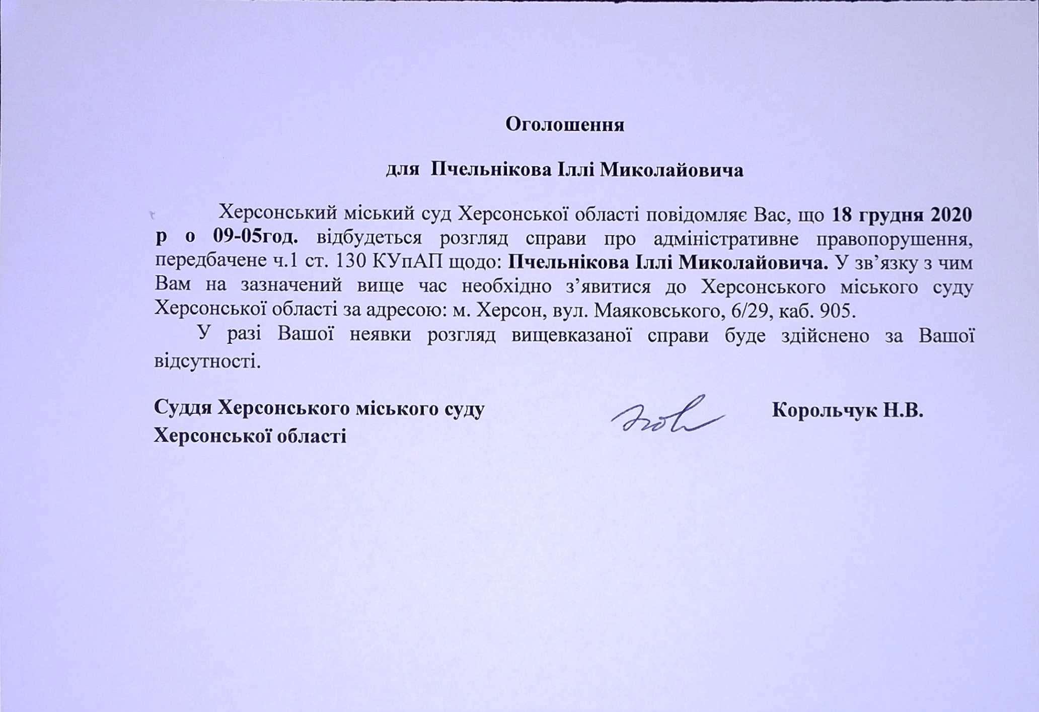 ОГОЛОШЕННЯ ПРО ВИКЛИК ДО СУДУ