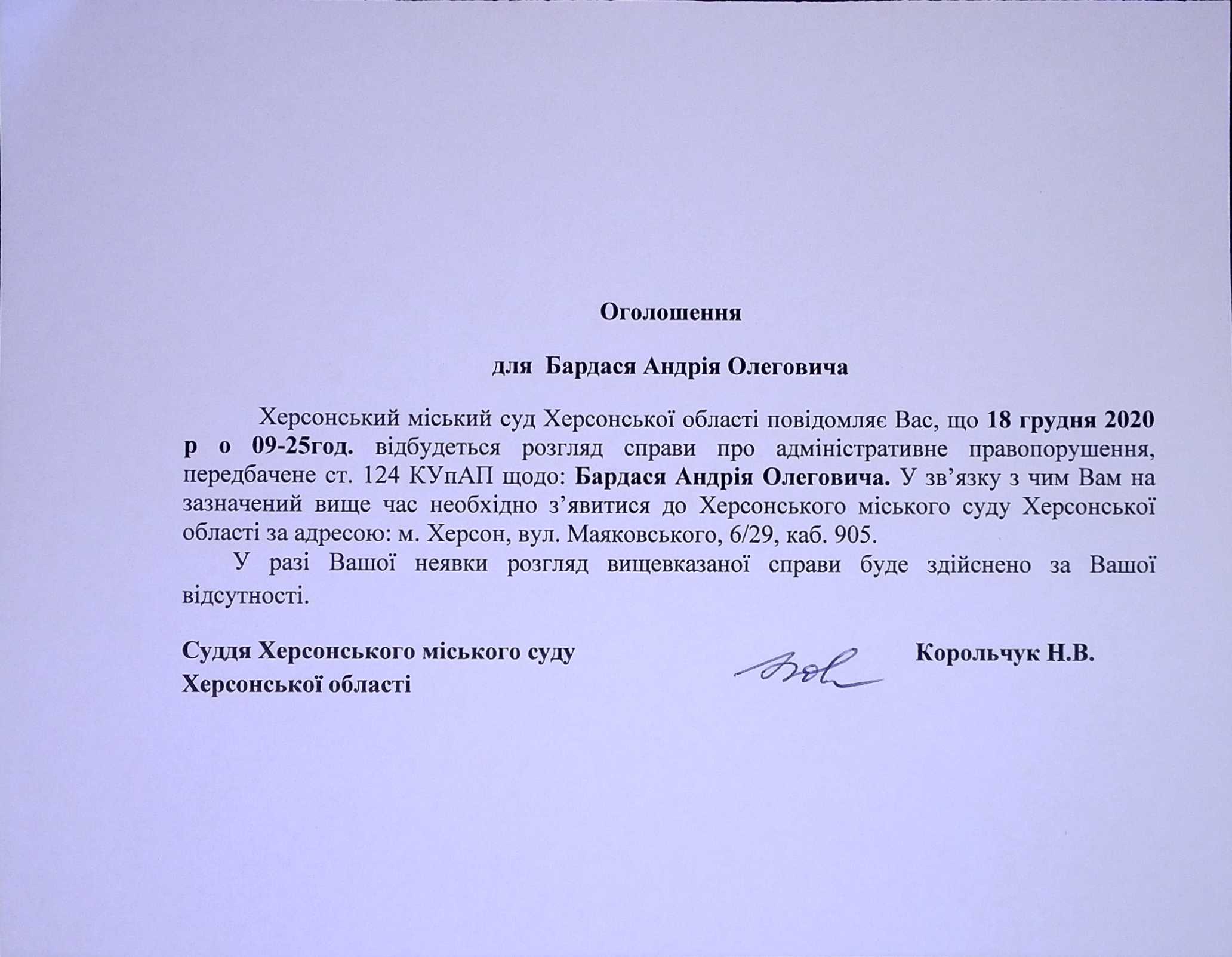 ОГОЛОШЕННЯ для Бардася Андрія Олеговича
