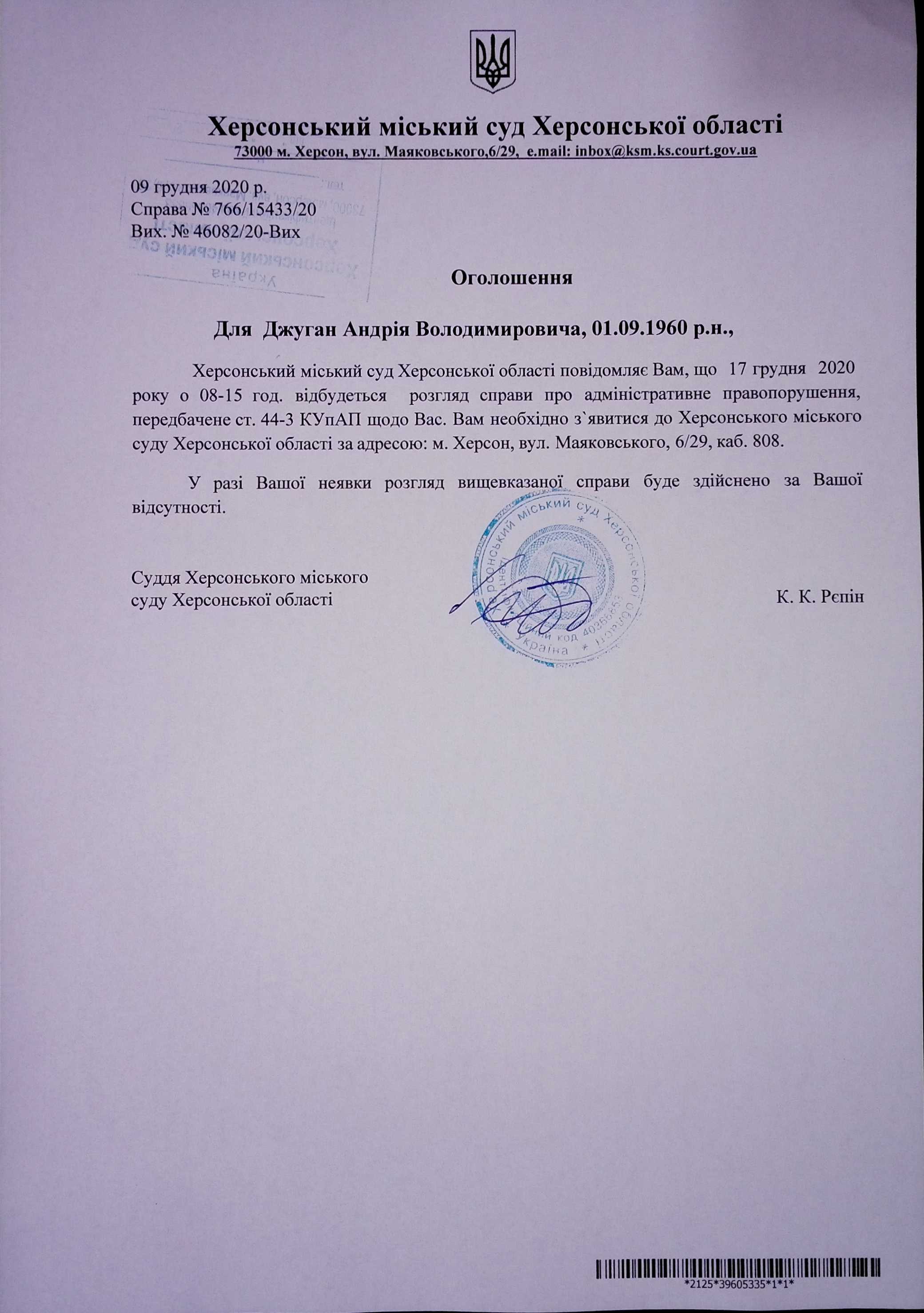 ОГОЛОШЕННЯ для Джуган Андрія Володимировича