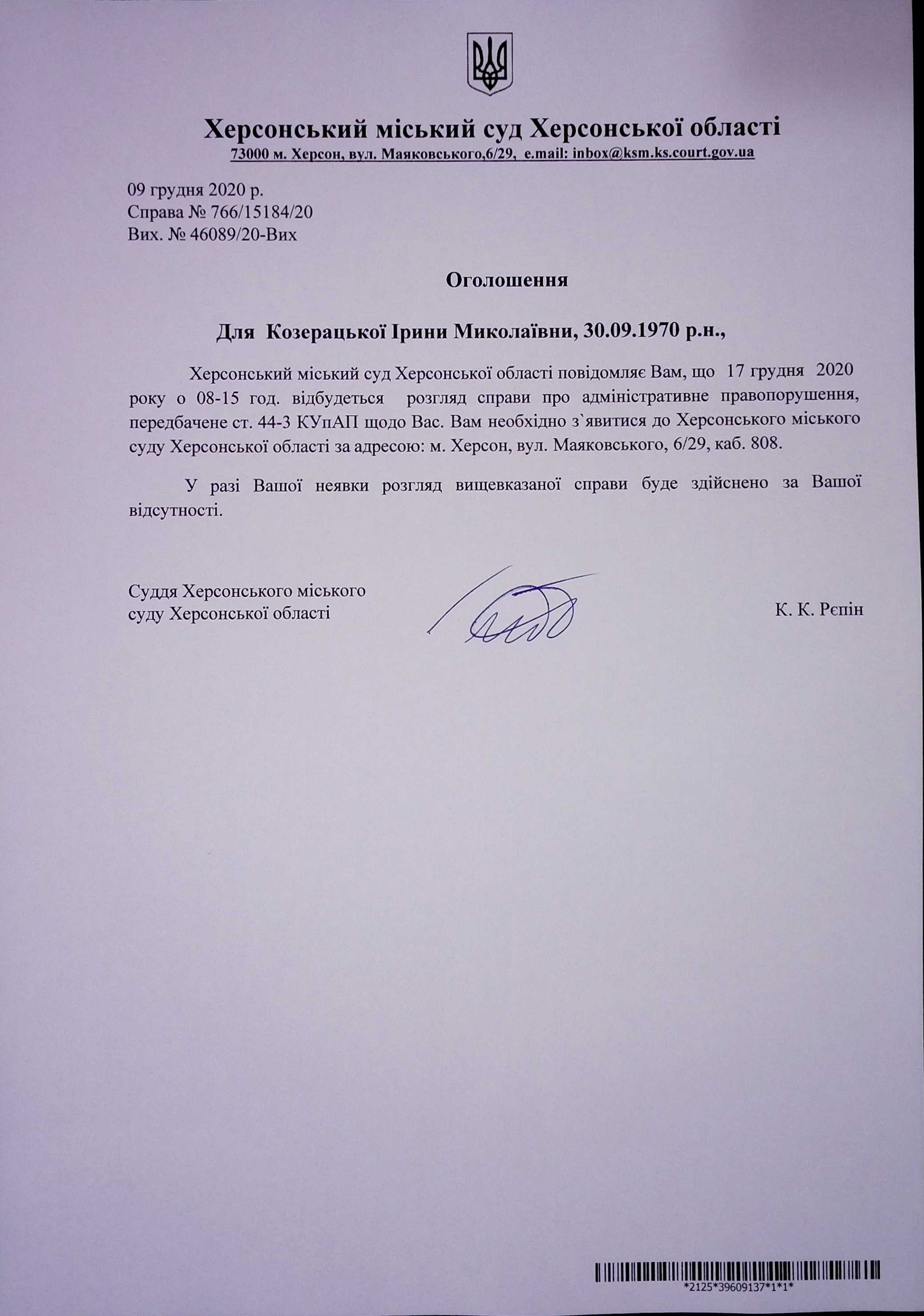 ОГОЛОШЕННЯ для Козерацької Ірини Миколаївни