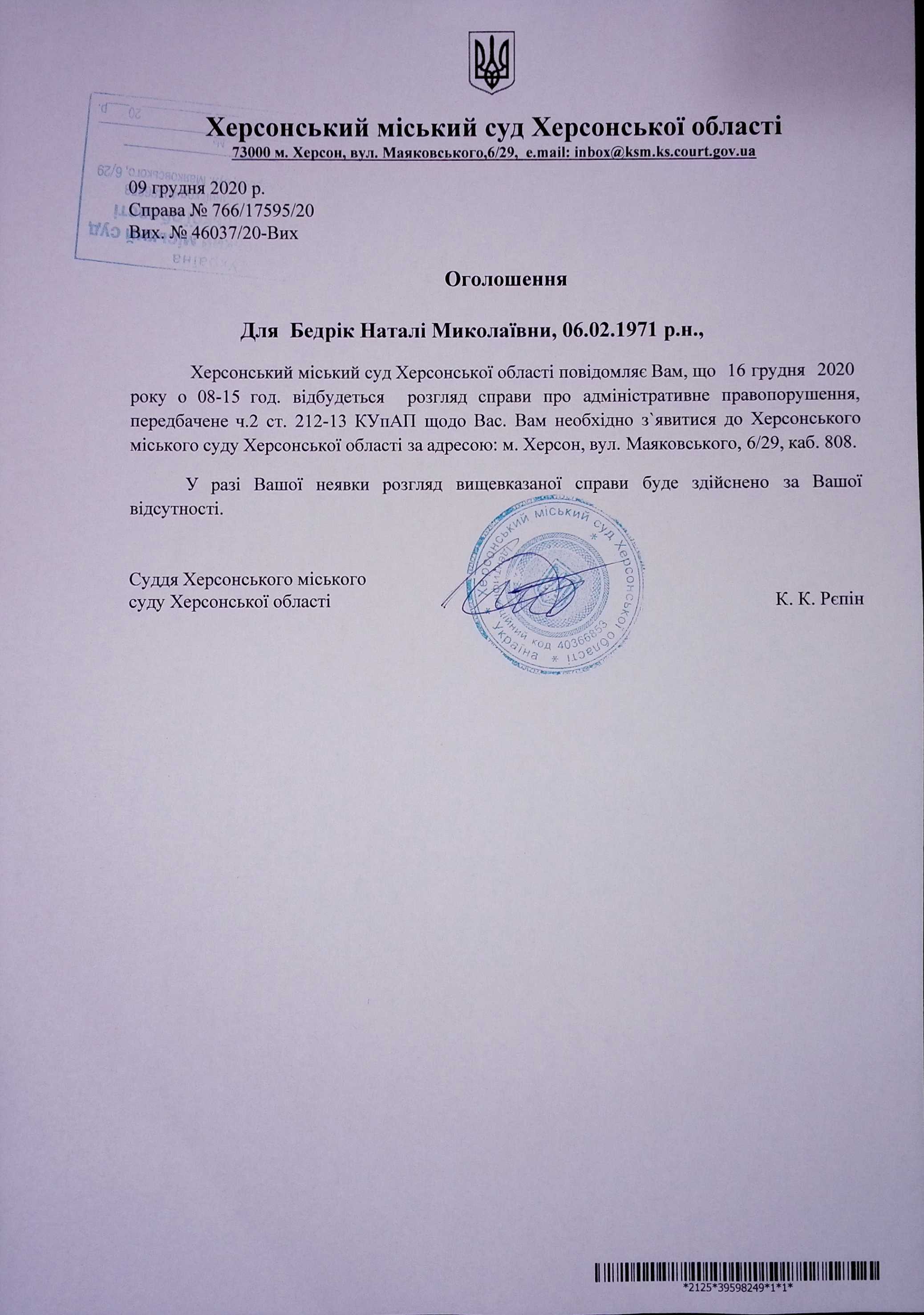 ОГОЛОШЕННЯ для Бедрік Наталі Миколаївни