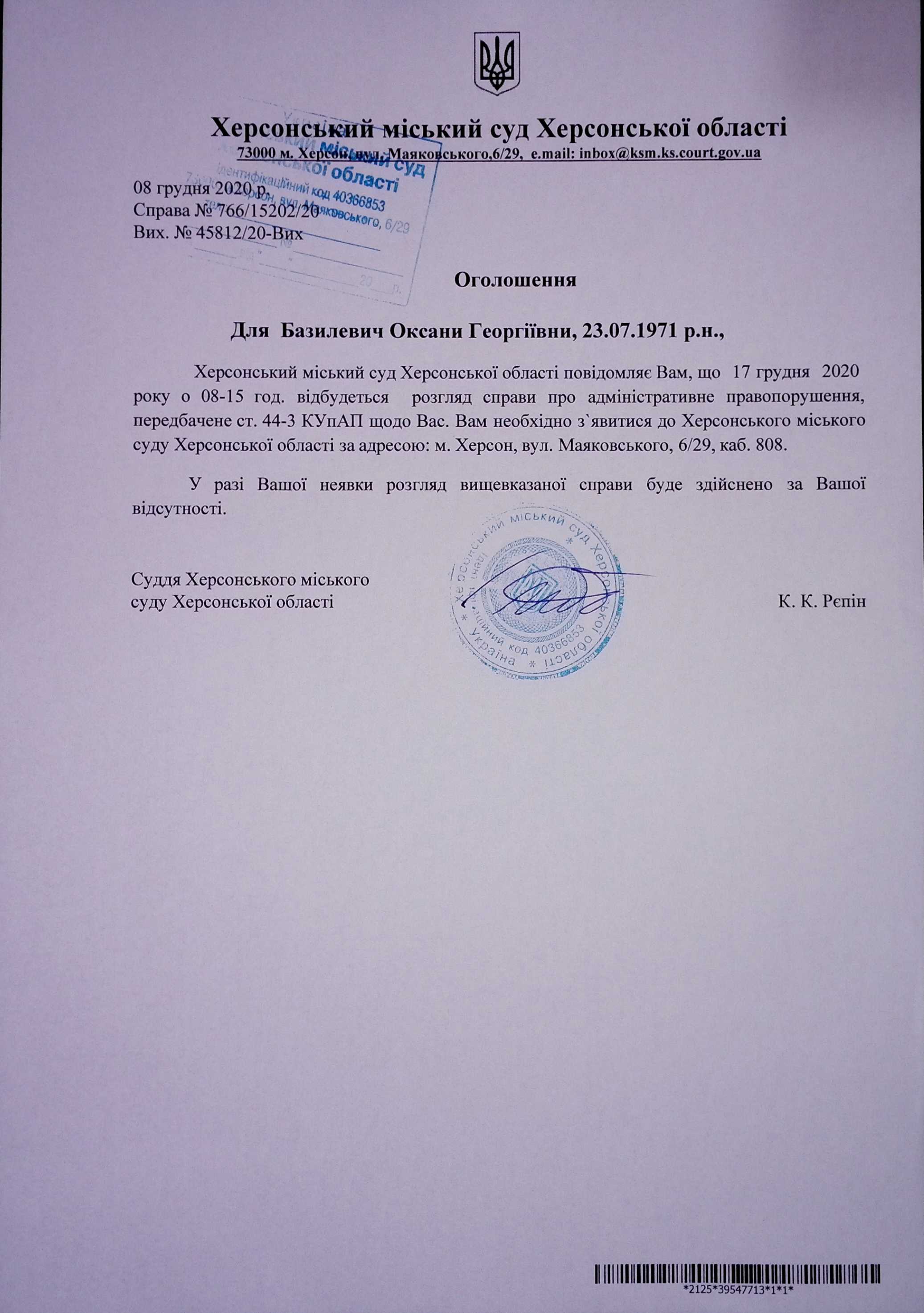 ОГОЛОШЕННЯ ПРО ВИКЛИК ДО СУДУ