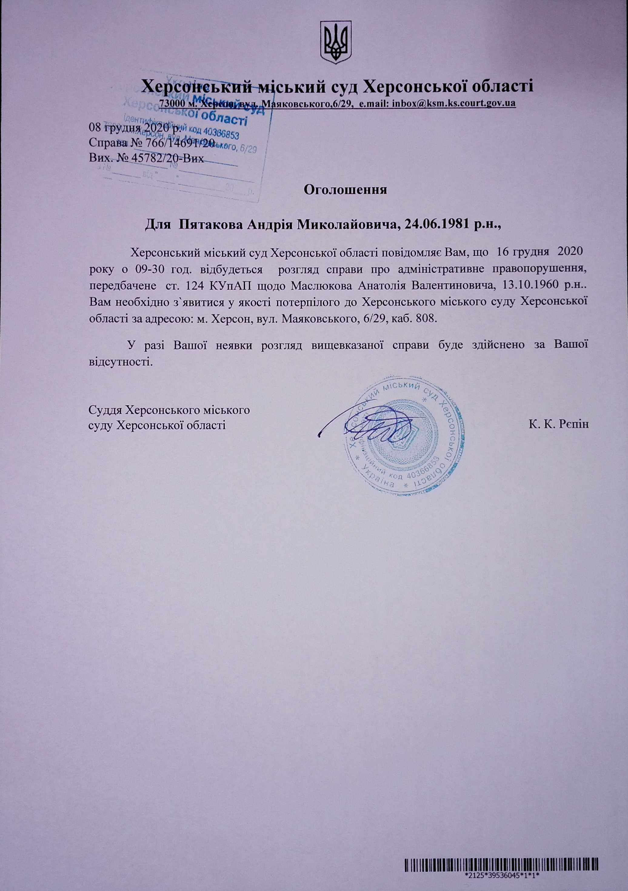 ОГОЛОШЕННЯ для Пятакова Андрія Миколайовича