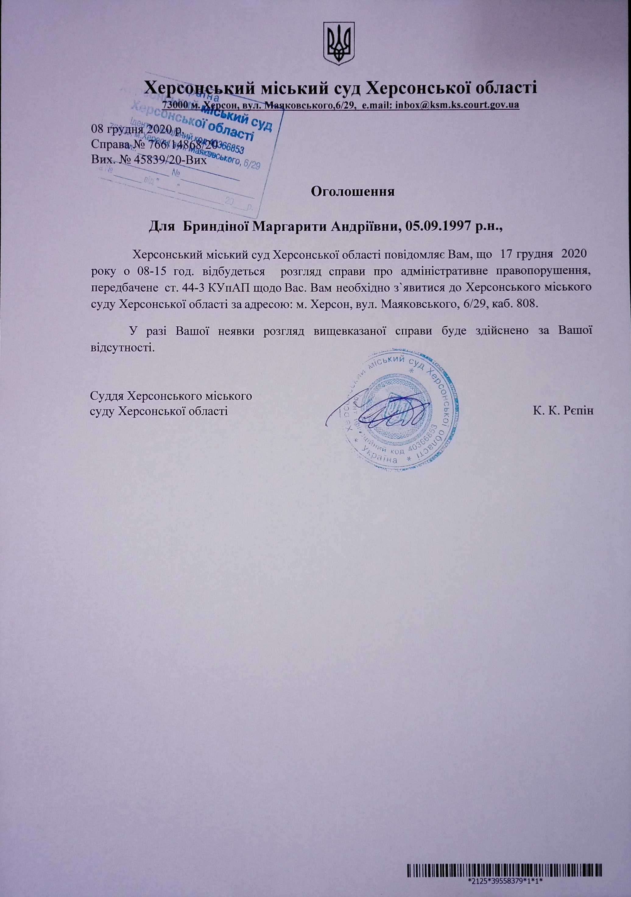 ОГОЛОШЕННЯ ПРО ВИКЛИК ДО СУДУ