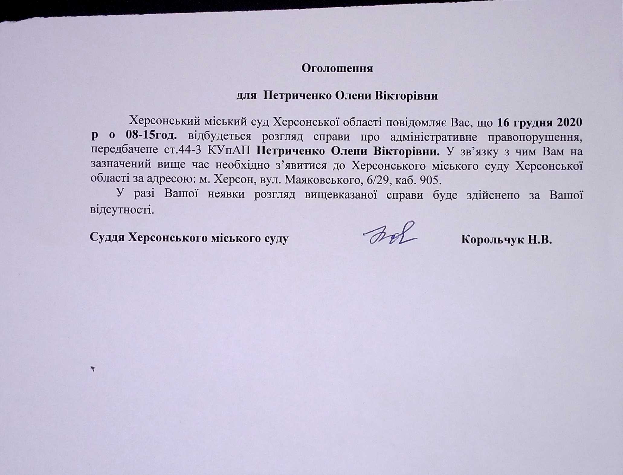 ОГОЛОШЕННЯ для Петриченко Олени Вікторівни