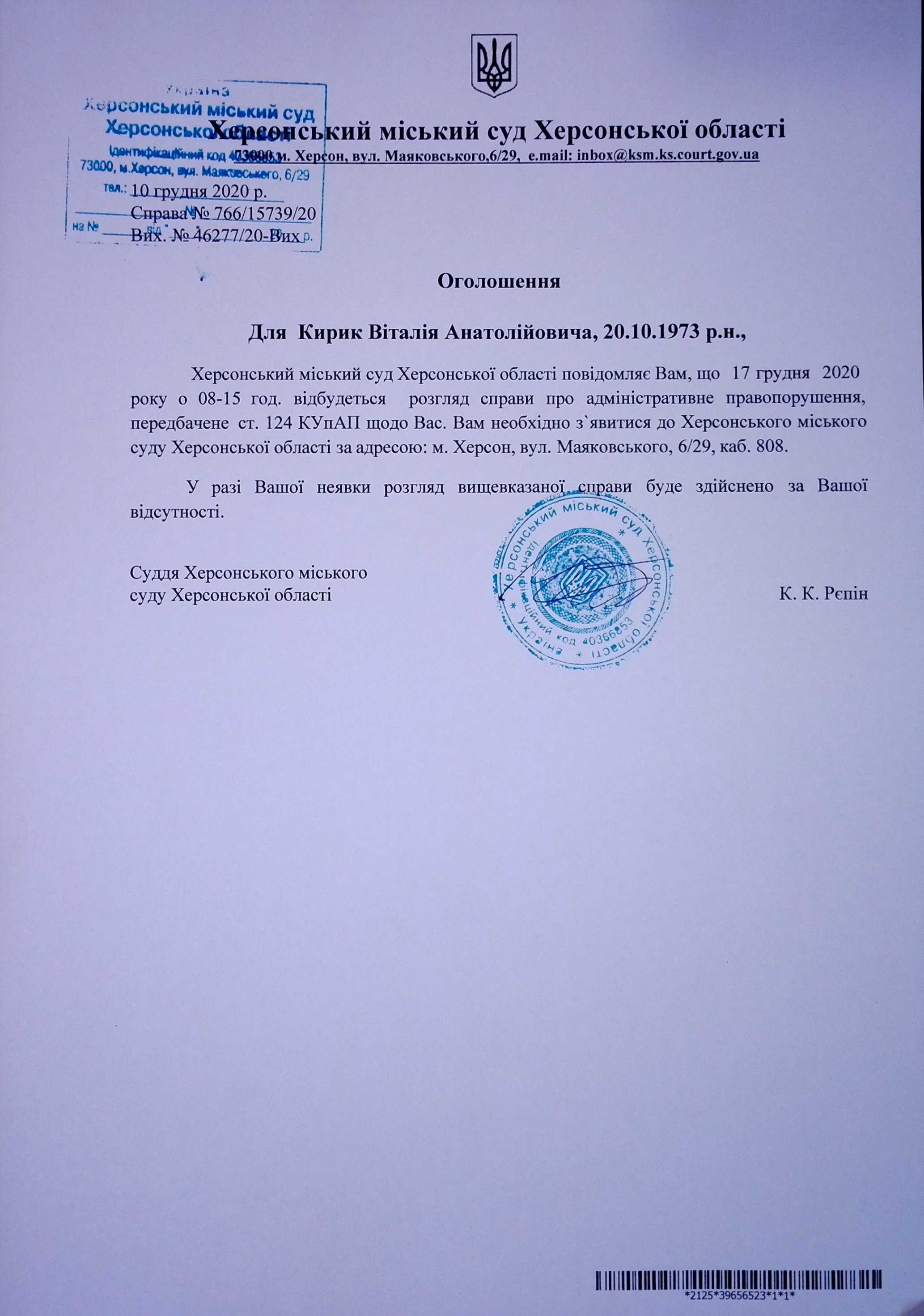 ОГОЛОШЕННЯ для Кирик Віталія Анатолійовича