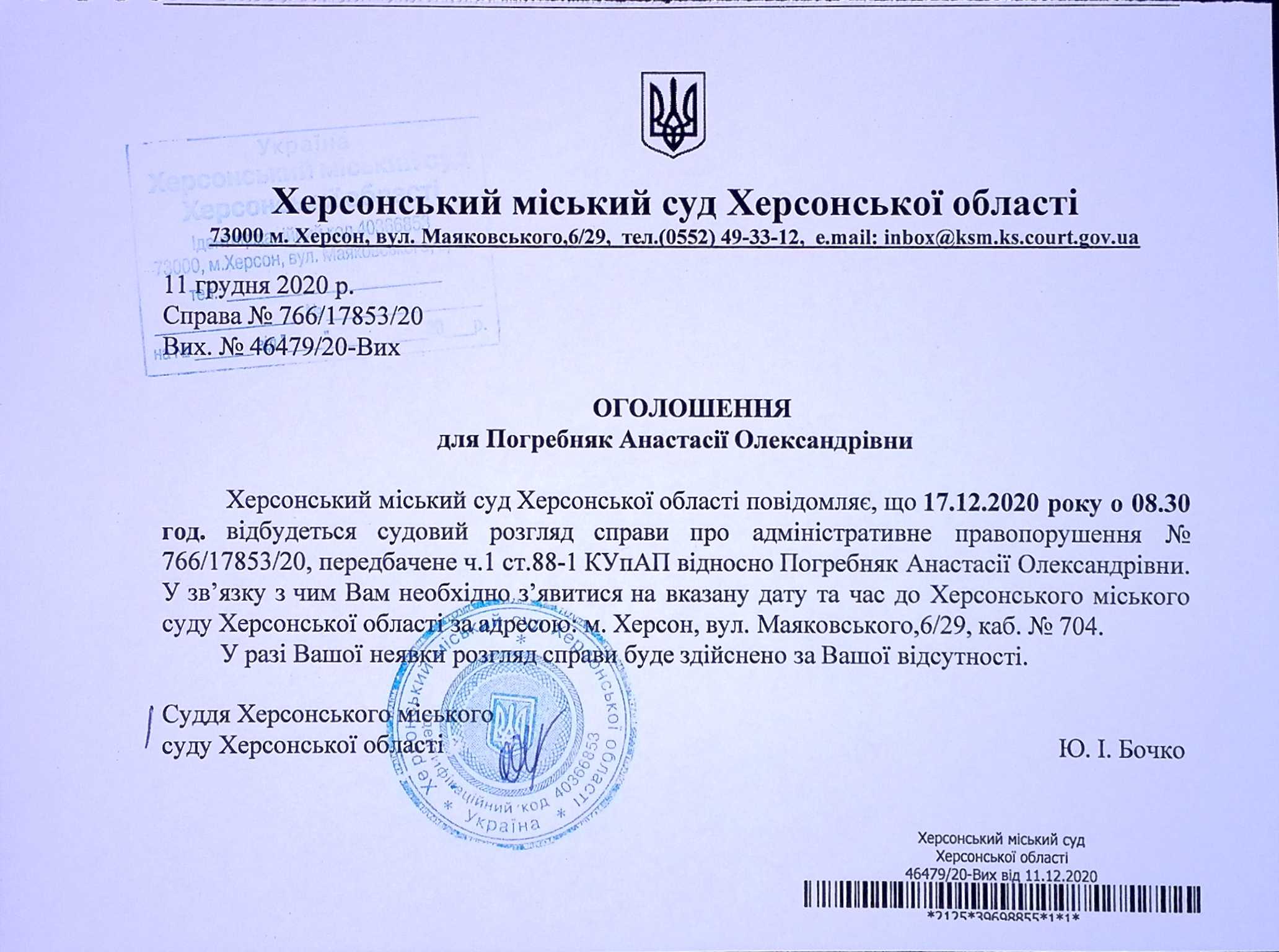 ОГОЛОШЕННЯ для Погребняк Анастасії Олександрівни