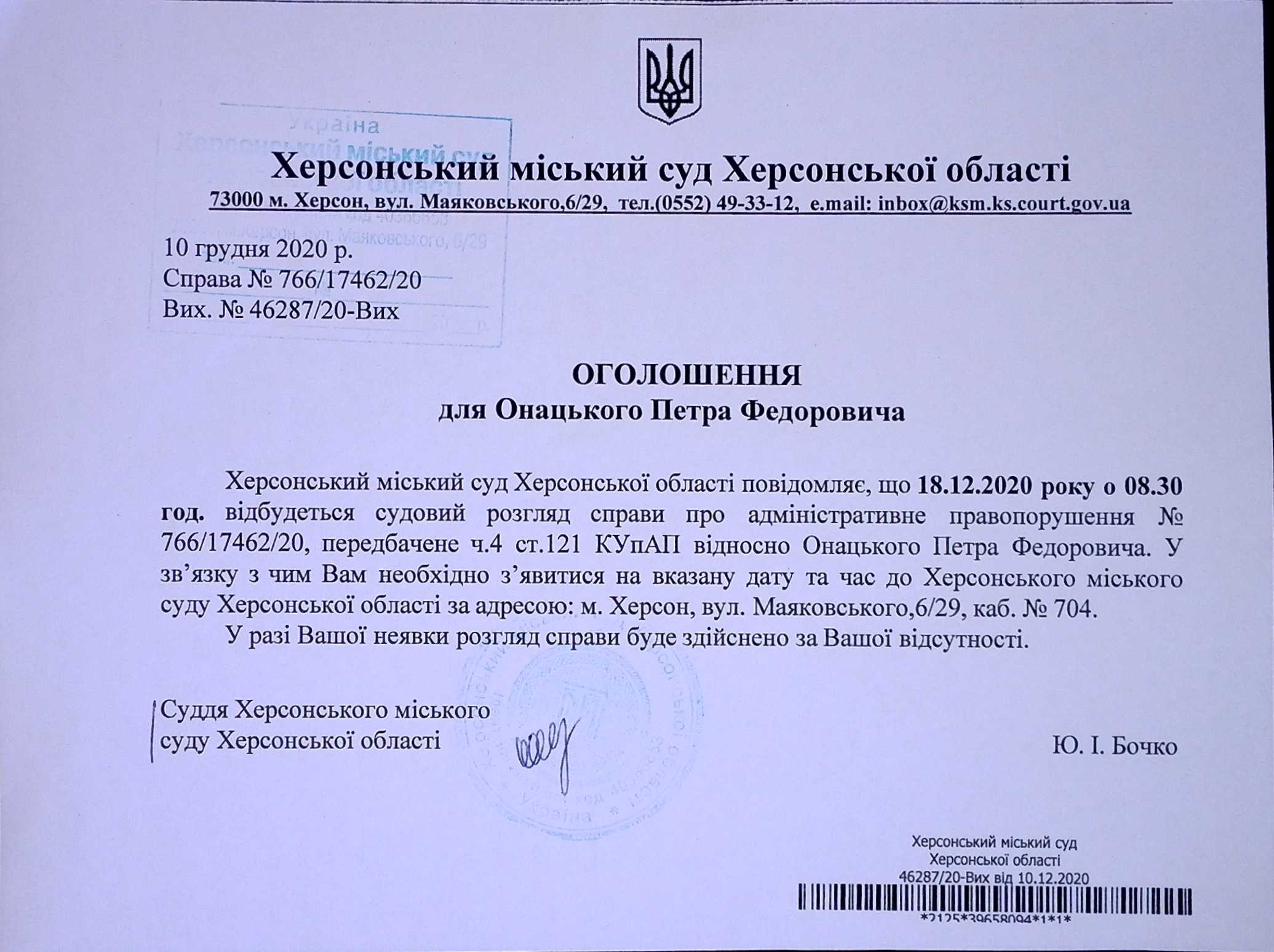 ОГОЛОШЕННЯ для Онацького Петра Федоровича