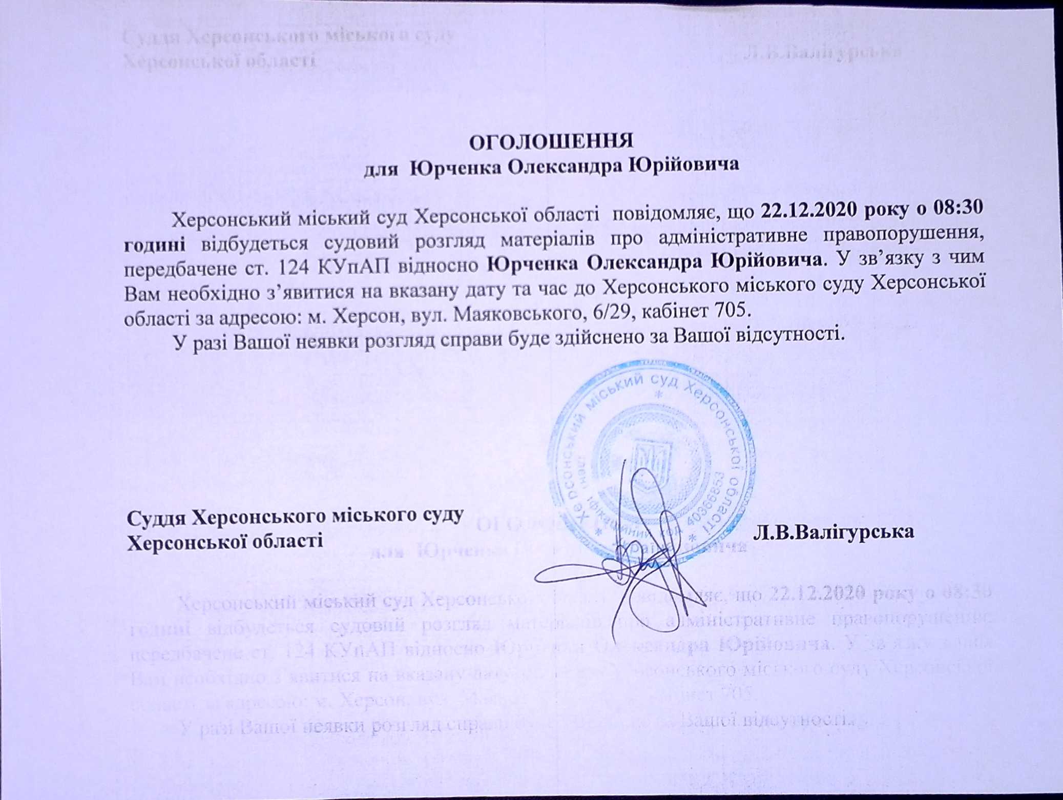 ОГОЛОШЕННЯ для Юрченка Олександра Юрійовича