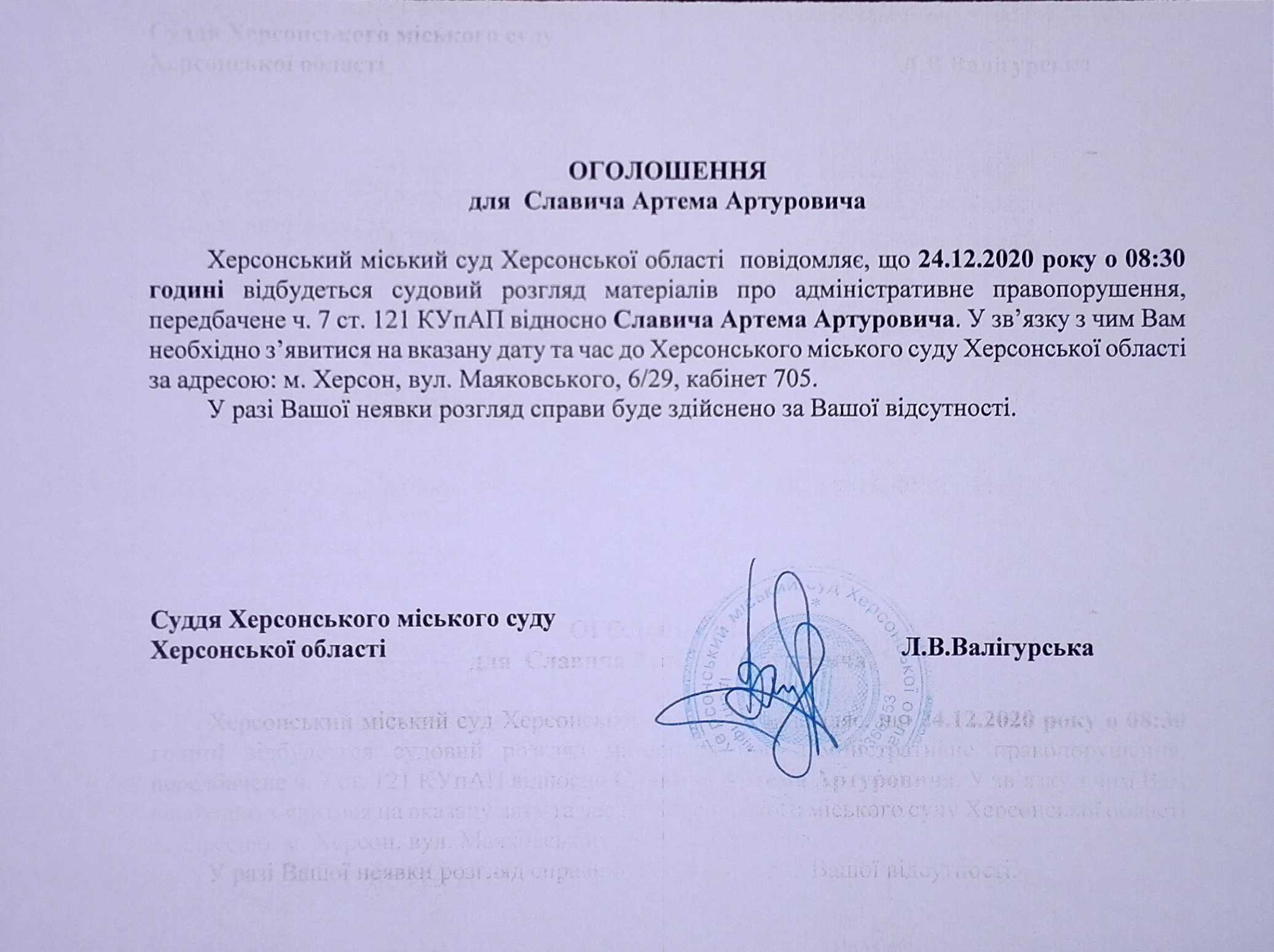 ОГОЛОШЕННЯ ПРО ВИКЛИК ДО СУДУ