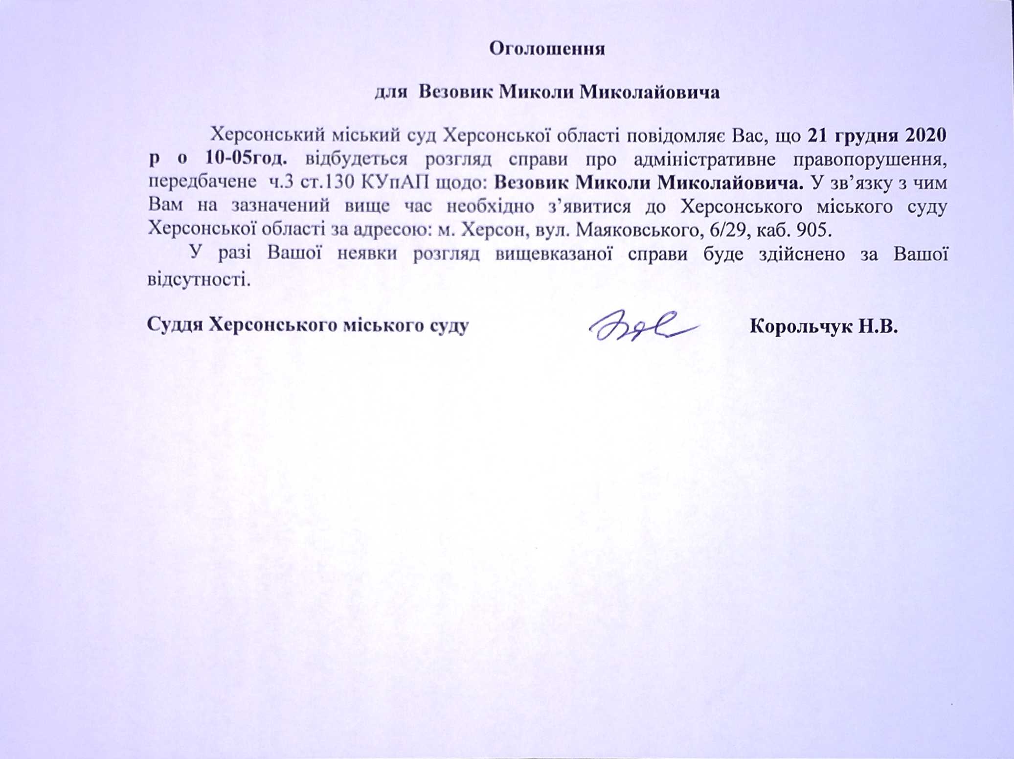 ОГОЛОШЕННЯ для Везовик Миколи Миколайовича