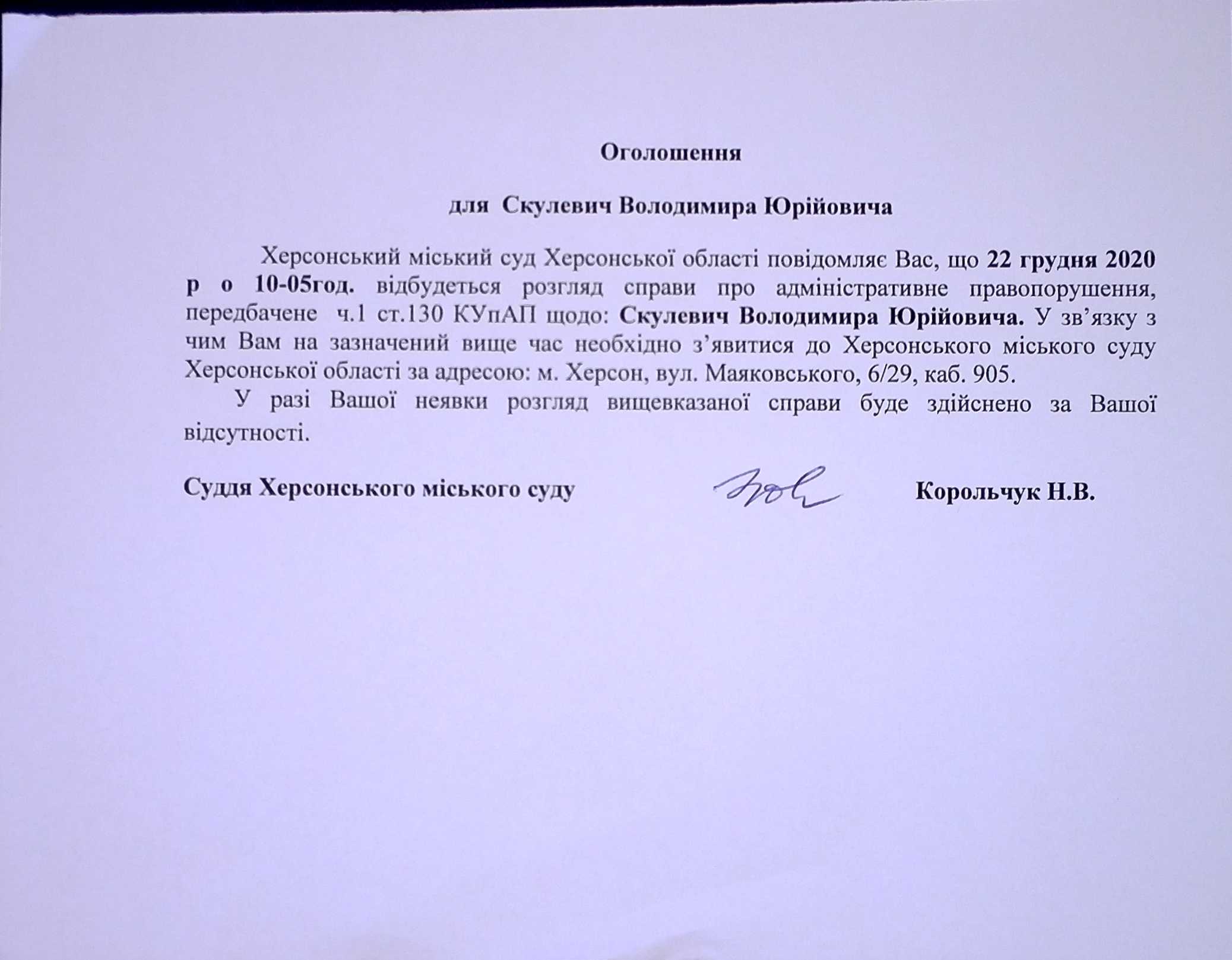 ОГОЛОШЕННЯ для Скулевич Володимира Юрійовича