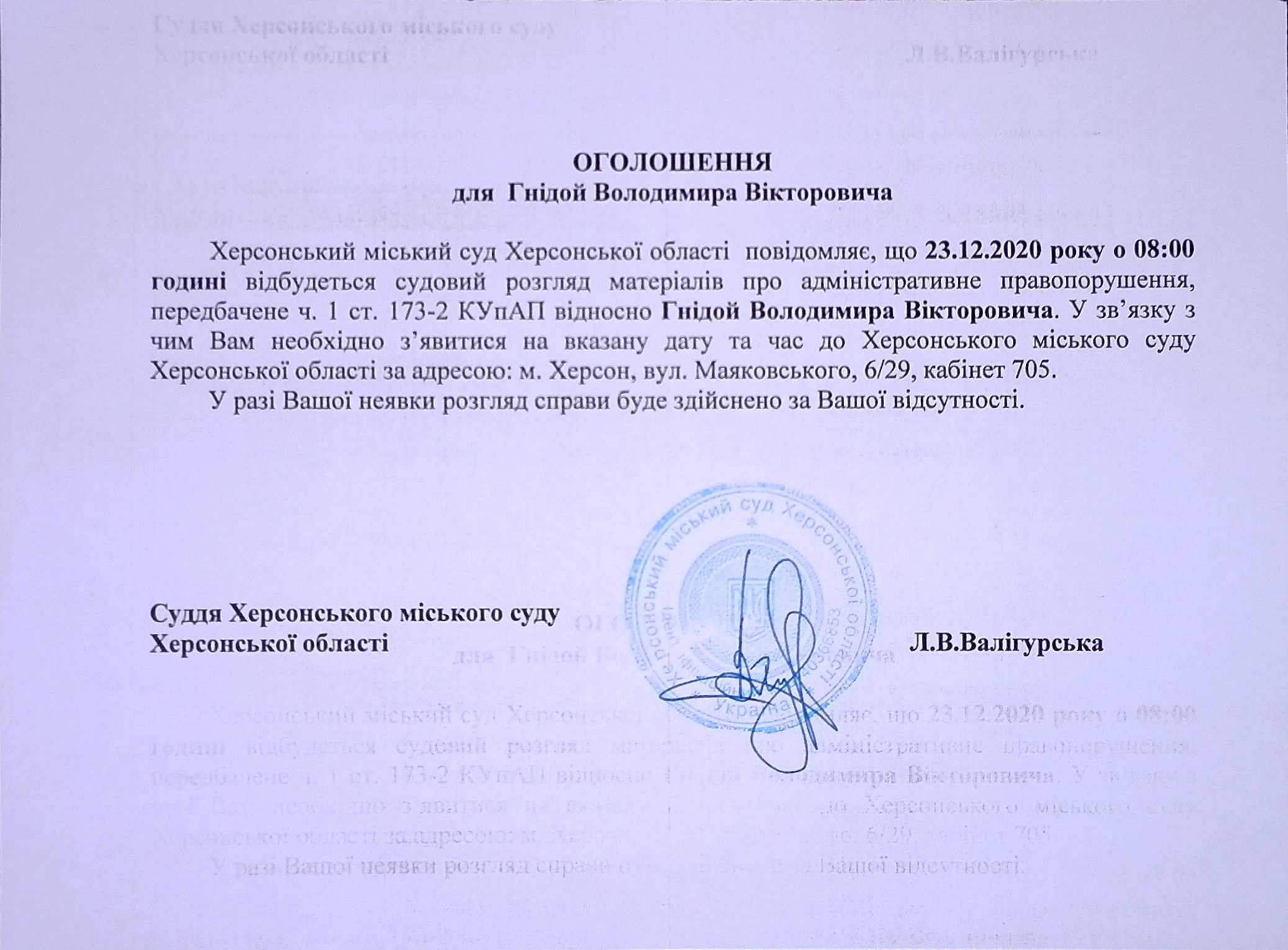 ОГОЛОШЕННЯ ПРО ВИКЛИК ДО СУДУ