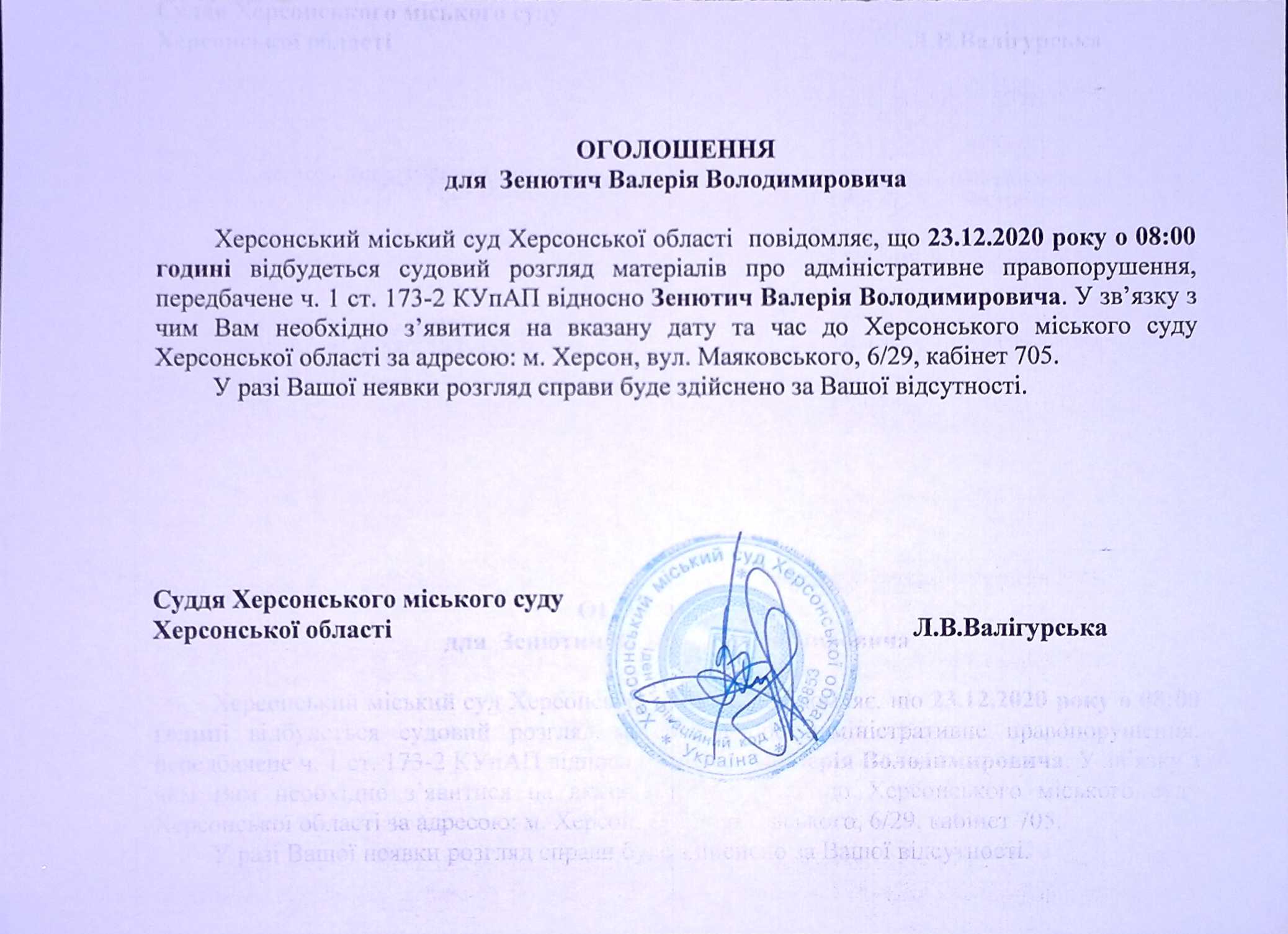 ОГОЛОШЕННЯ для Зенютич Валерія Володимировича