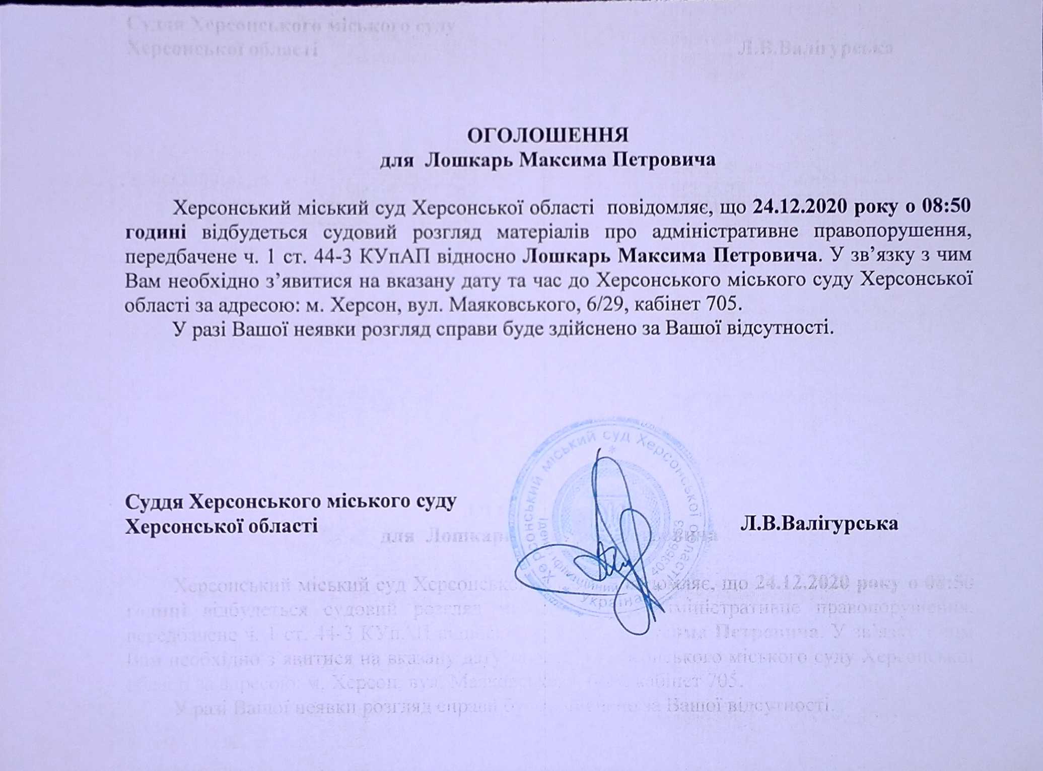 ОГОЛОШЕННЯ для Лошкарь Максима Петровича