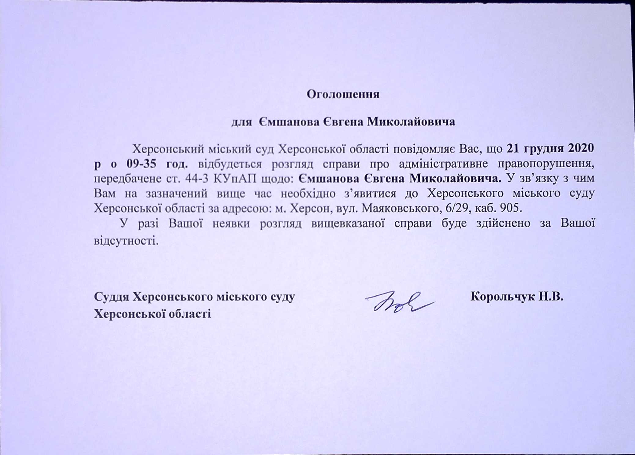 ОГОЛОШЕННЯ для Ємшанова Євгена Миколайовича