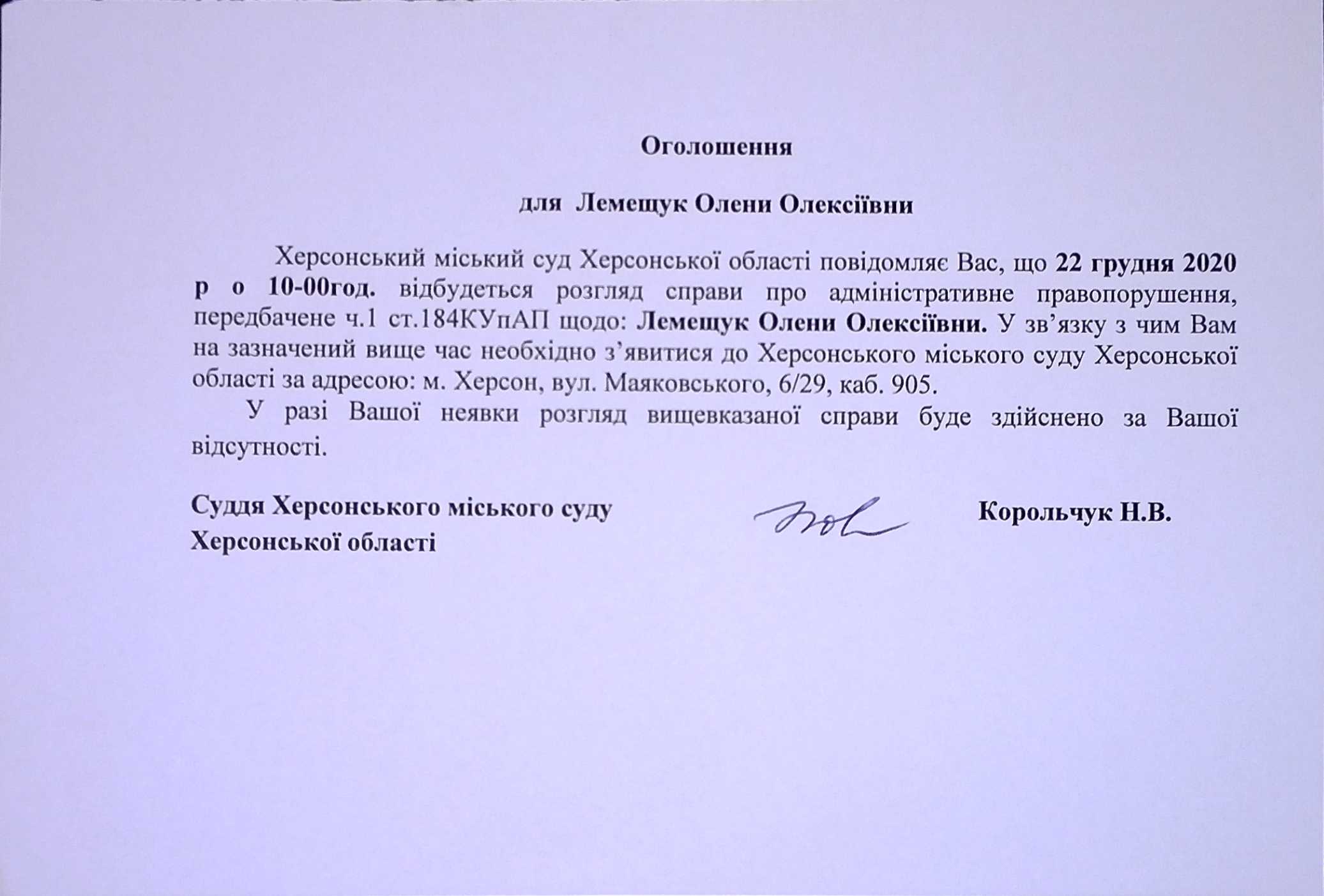 ОГОЛОШЕННЯ для Лемещук Олени Олексіївни