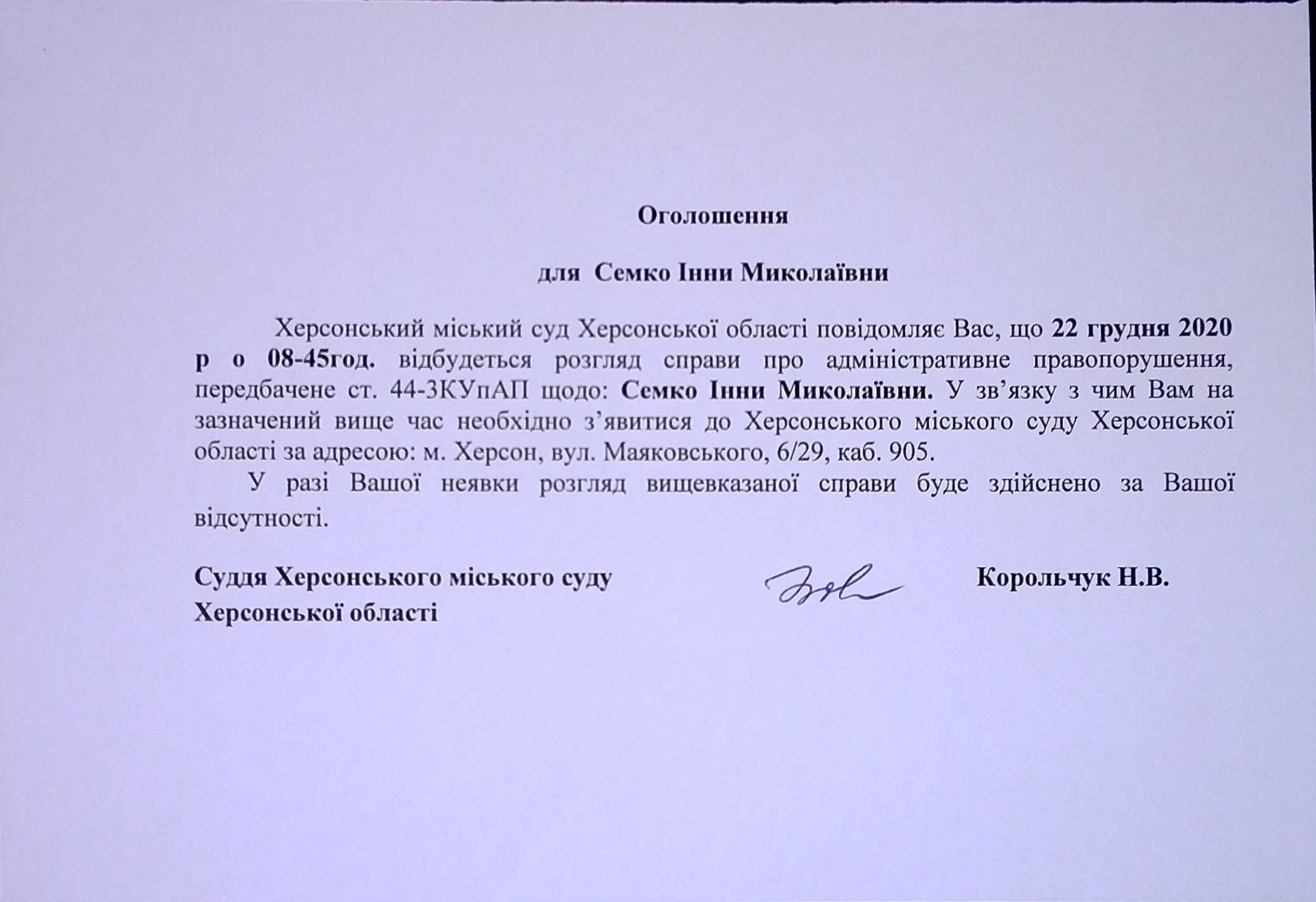 ОГОЛОШЕННЯ ПРО ВИКЛИК ДО СУДУ