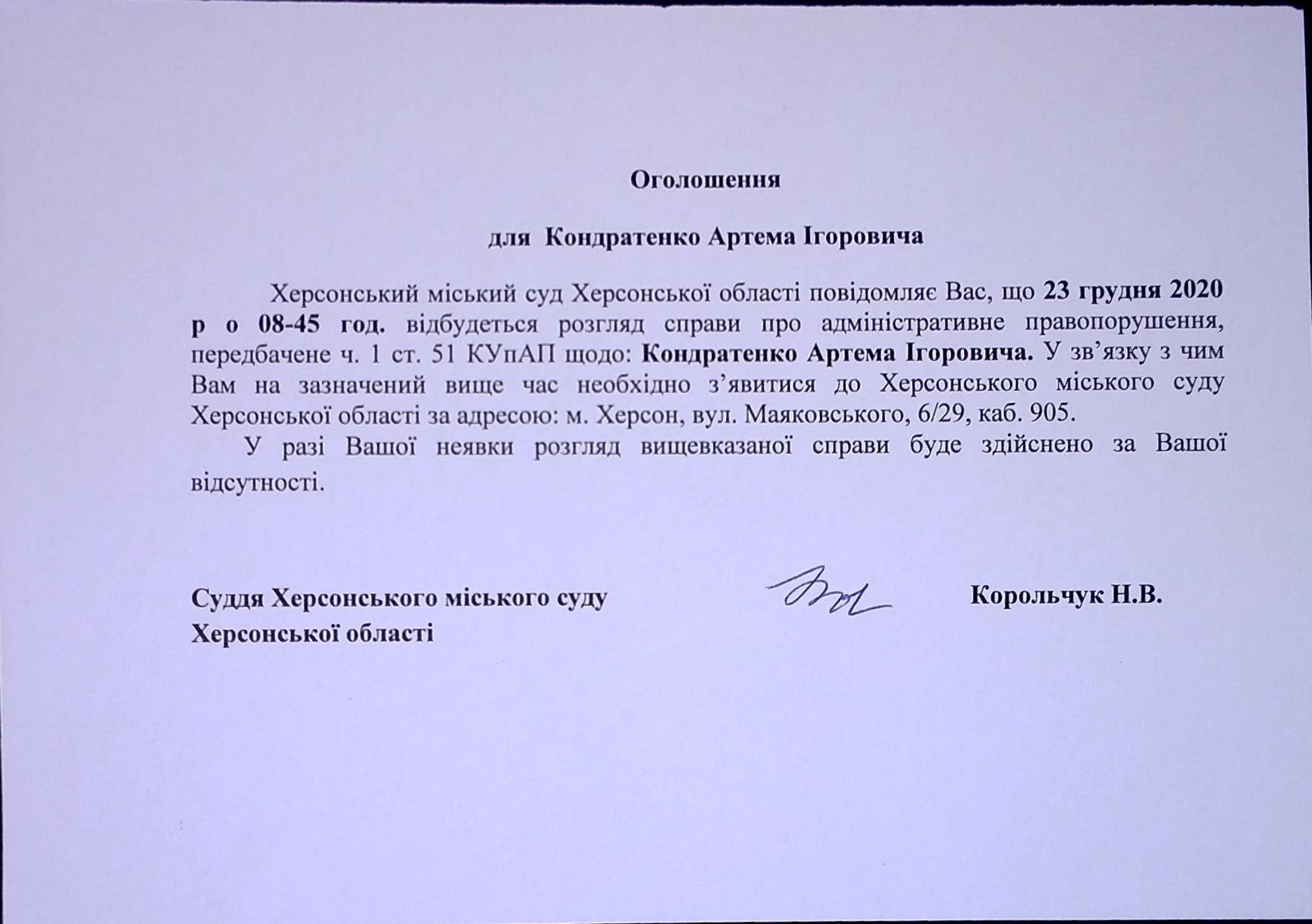 ОГОЛОШЕННЯ для Кондратенко Артема Ігоровича
