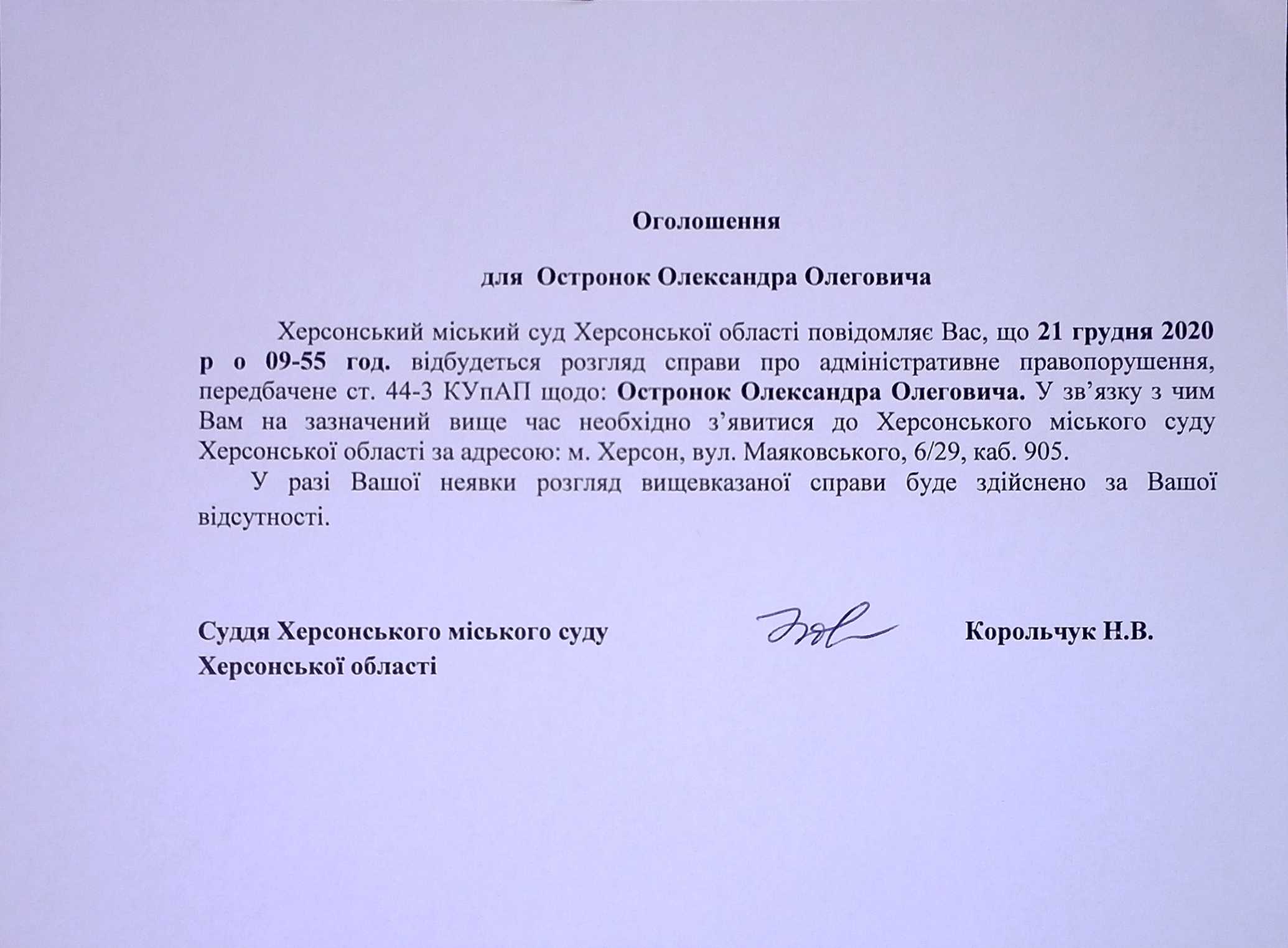 ОГОЛОШЕННЯ для Остронок Олександра Олеговича