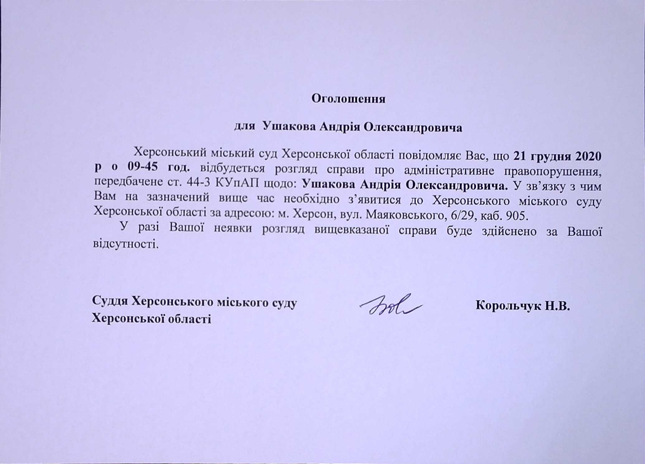 ОГОЛОШЕННЯ для Ушакова Андрія Олександровича