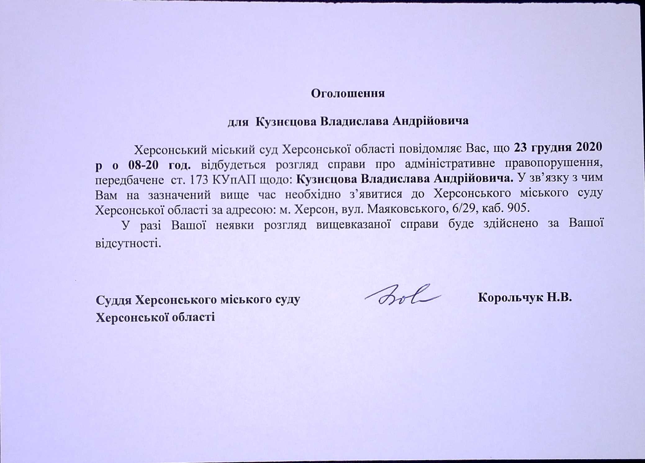 ОГОЛОШЕННЯ для Кузнєцова Владислава Андрійовича