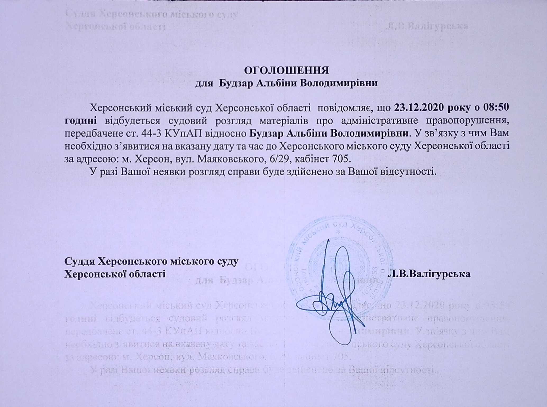 ОГОЛОШЕННЯ ПРО ВИКЛИК ДО СУДУ