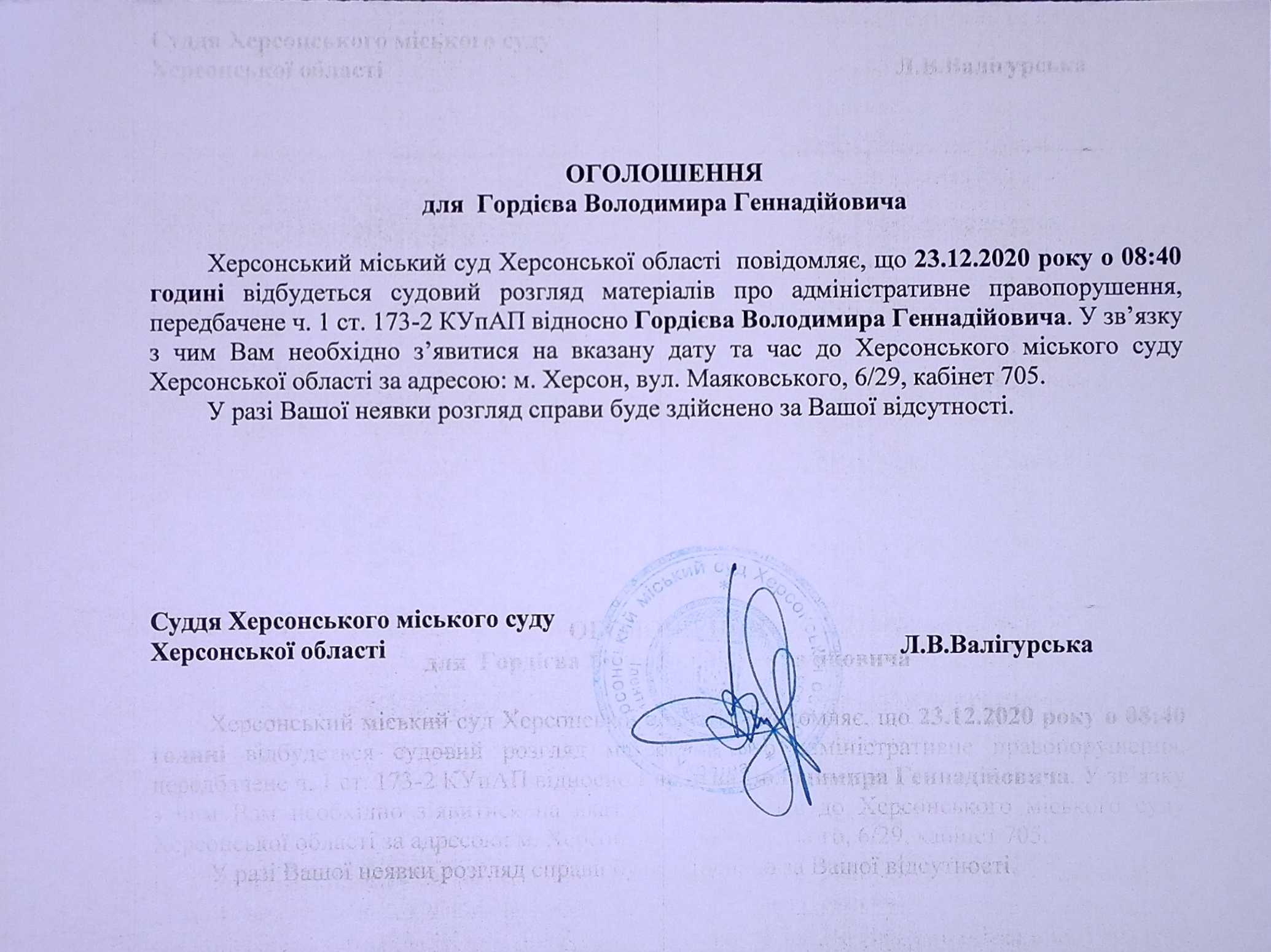 ОГОЛОШЕННЯ для Гордієва Володимира Геннадійовича
