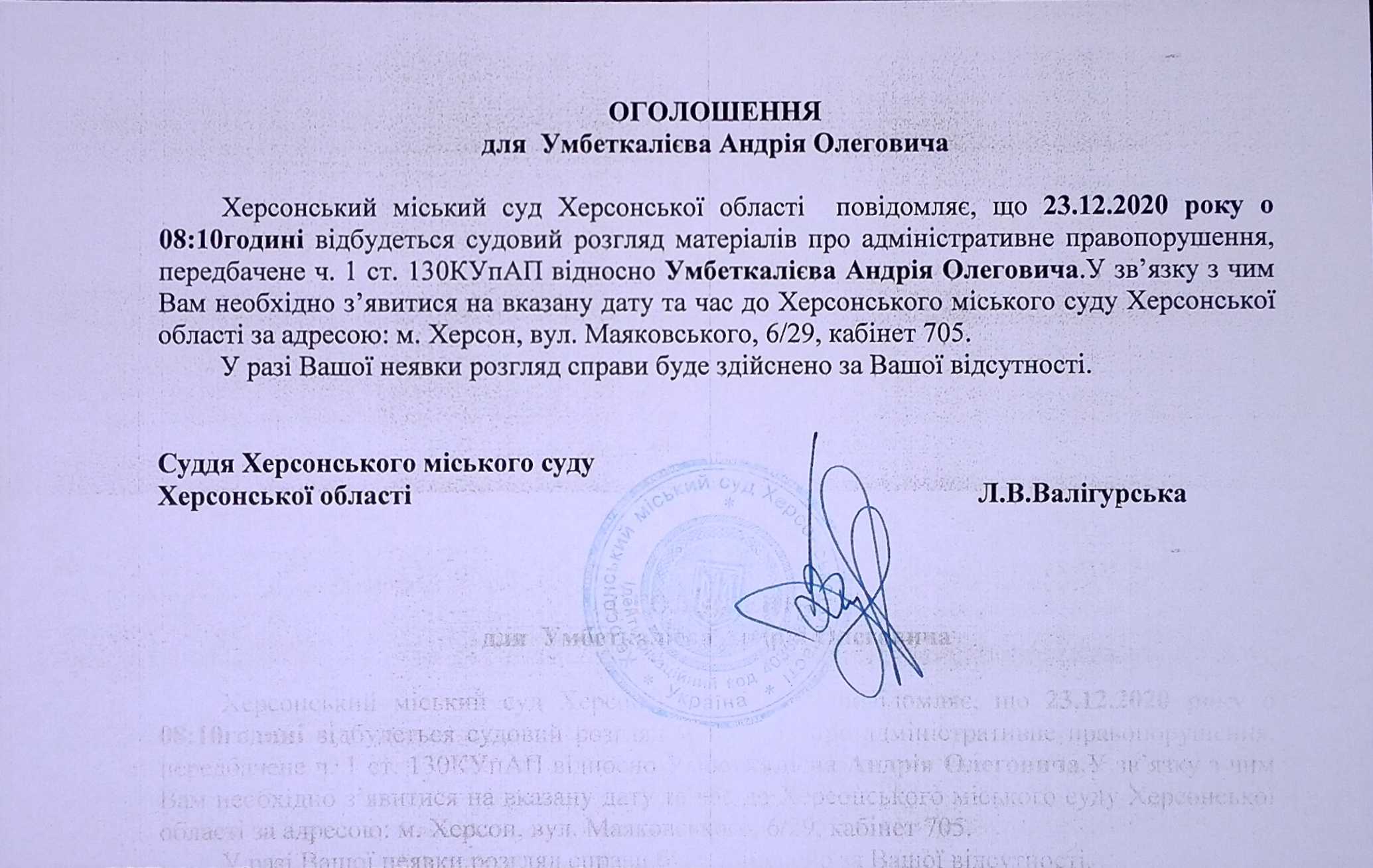 ОГОЛОШЕННЯ для Умбеткалієва Андрія Олеговича