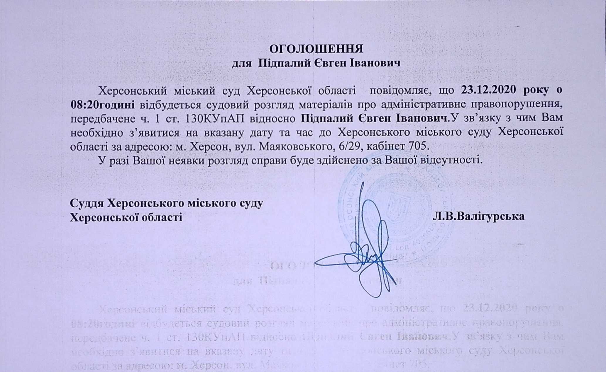 ОГОЛОШЕННЯ ПРО ВИКЛИК ДО СУДУ