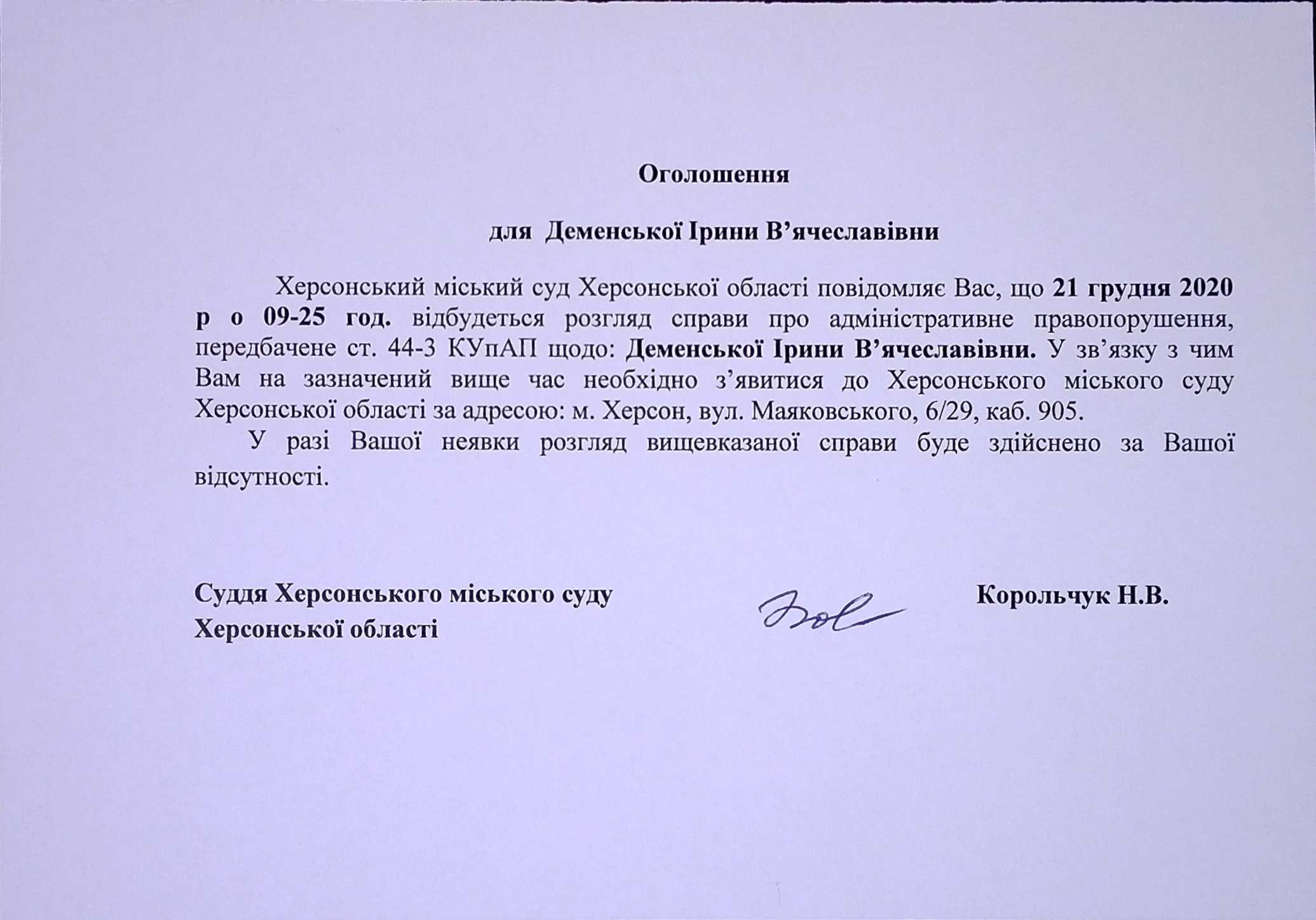 ОГОЛОШЕННЯ для Деменьскої Ірини Вячеславівни