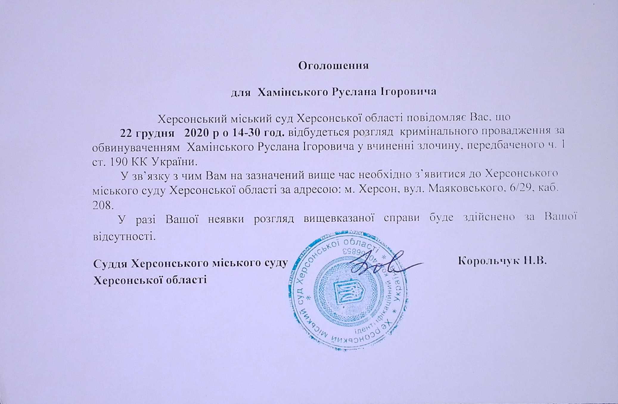 ОГОЛОШЕННЯ для Хамінського Руслана Ігоровича