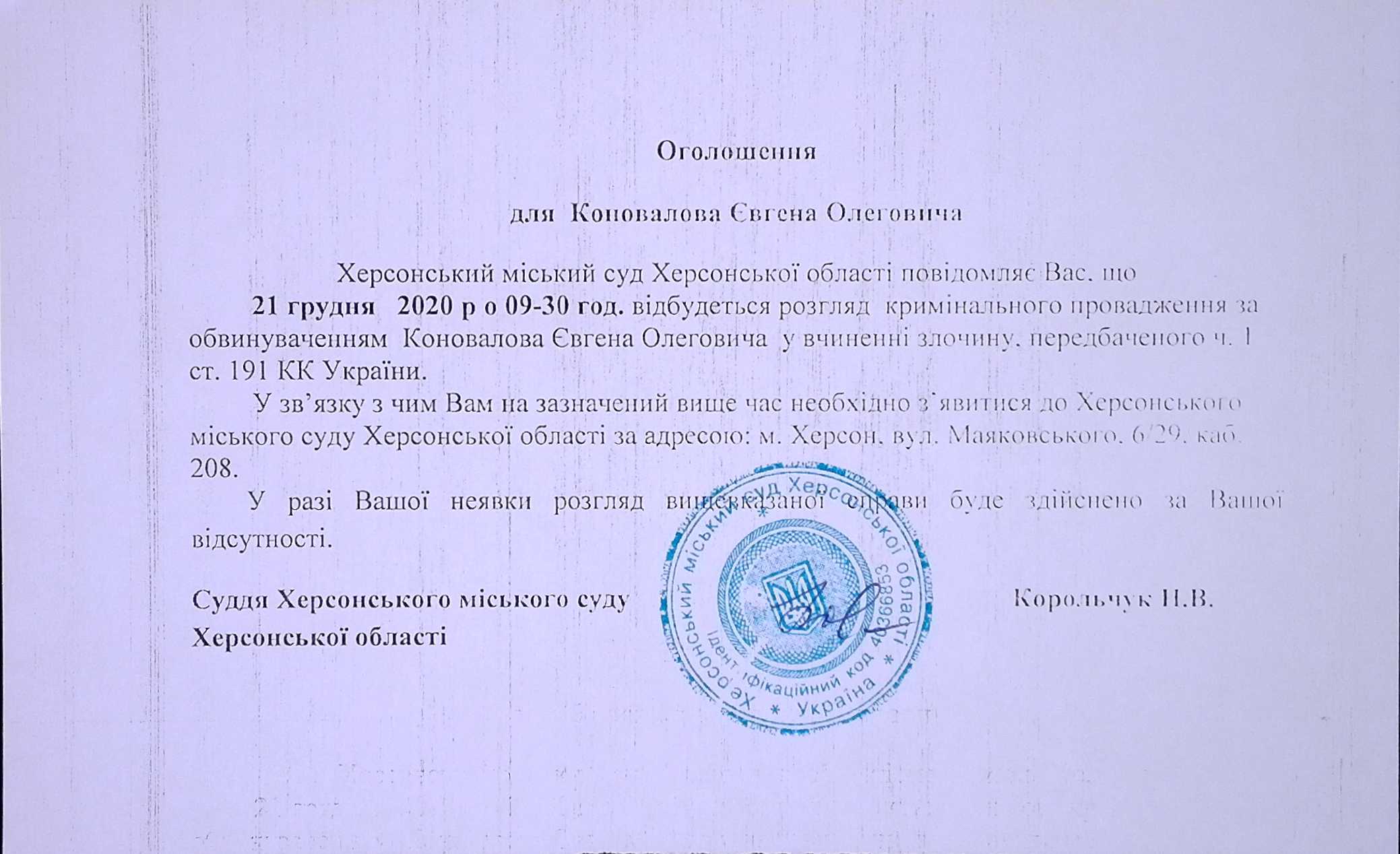 ОГОЛОШЕННЯ для Коновалова Євгена Олеговича