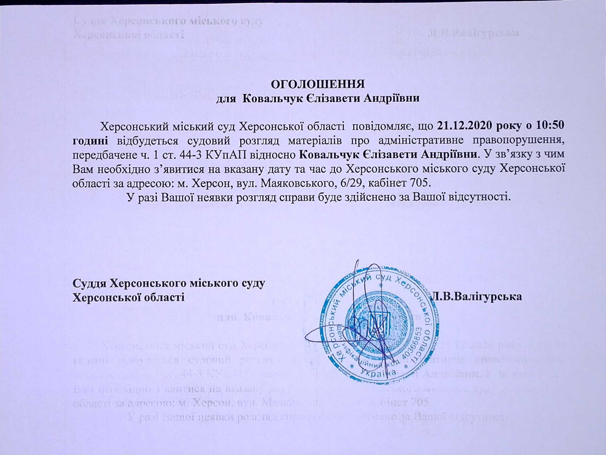 ОГОЛОШЕННЯ для Ковальчук Єлізавети Андріївни