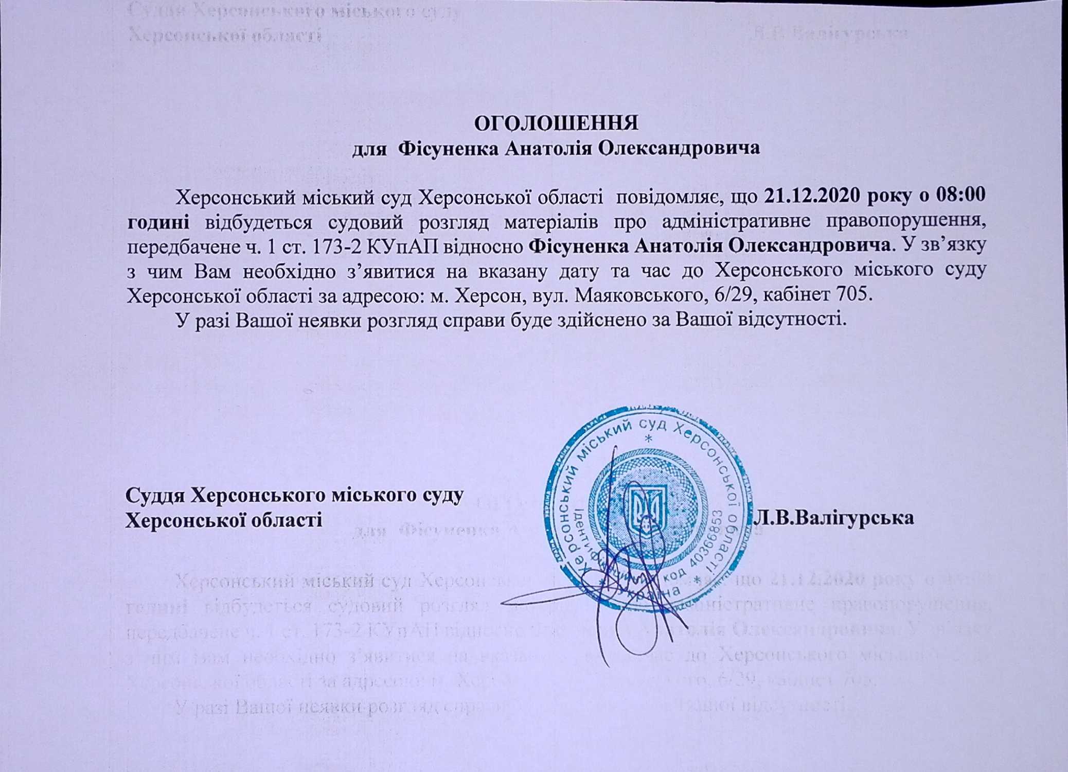 ОГОЛОШЕННЯ для Фісуненка Анатолія Олександровича
