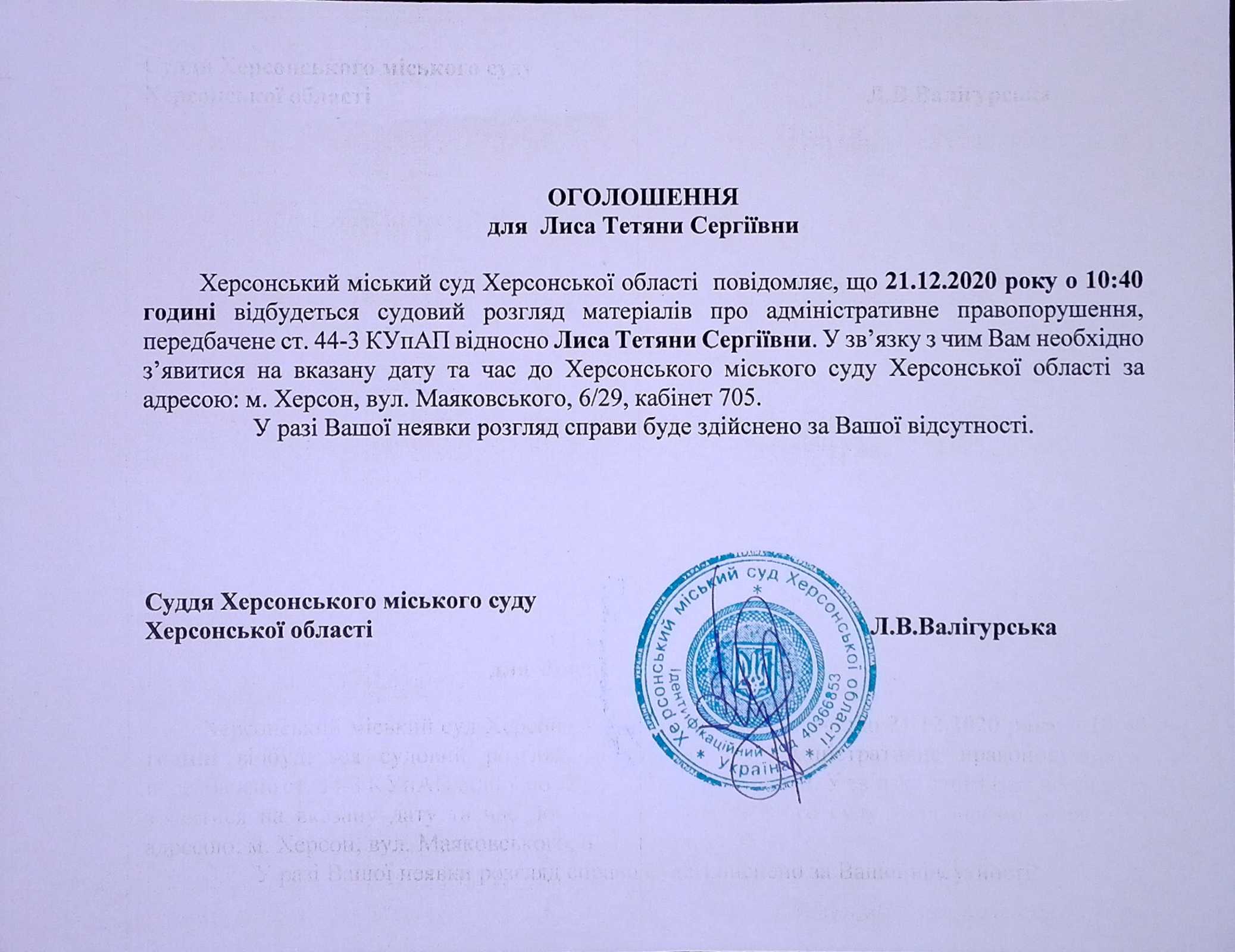 ОГОЛОШЕННЯ ПРО ВИКЛИК ДО СУДУ