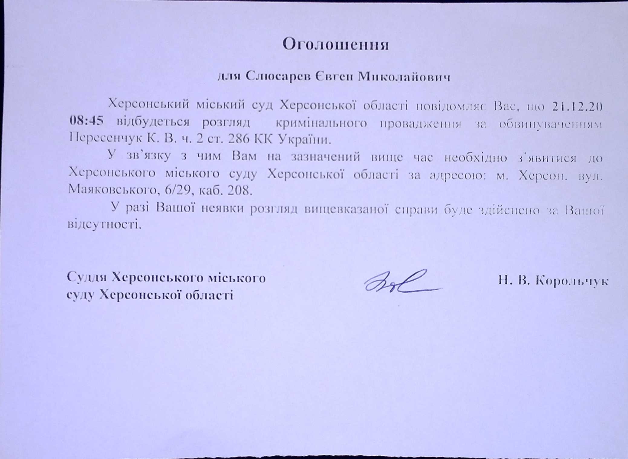 ОГОЛОШЕННЯ ПРО ВИКЛИК ДО СУДУ