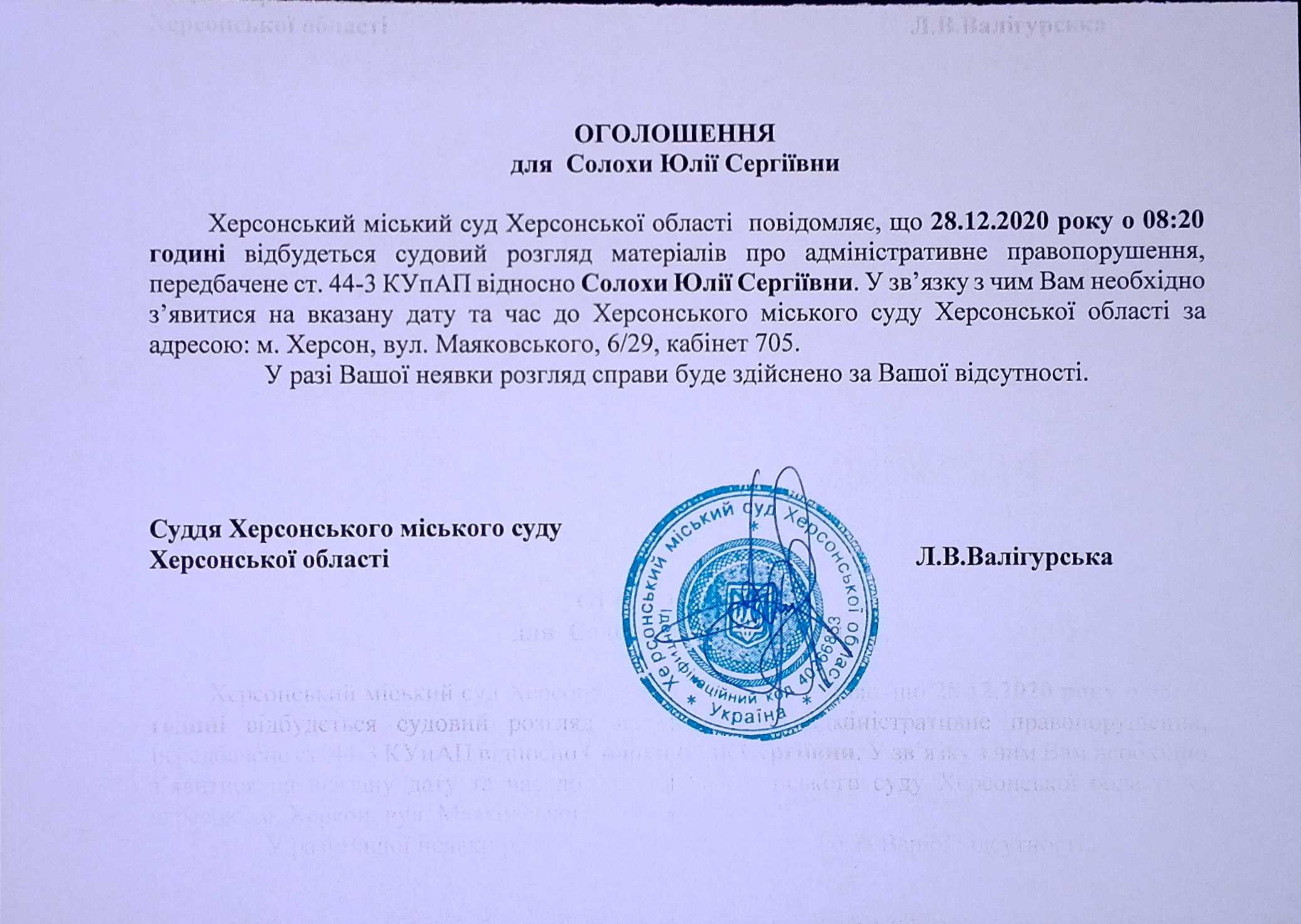 ОГОЛОШЕННЯ для Солохи Юлії Сергіївни
