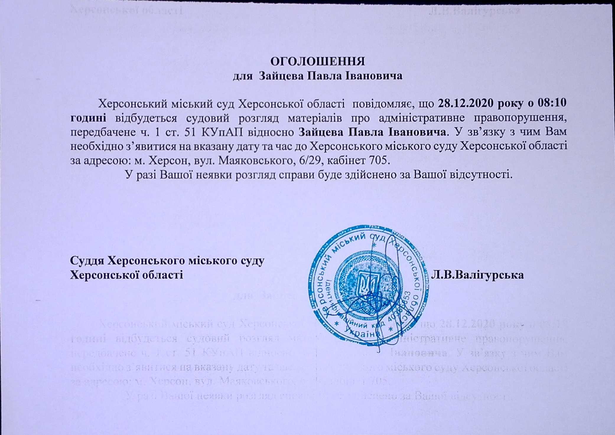 ОГОЛОШЕННЯ для Зайцева Павла Івановича