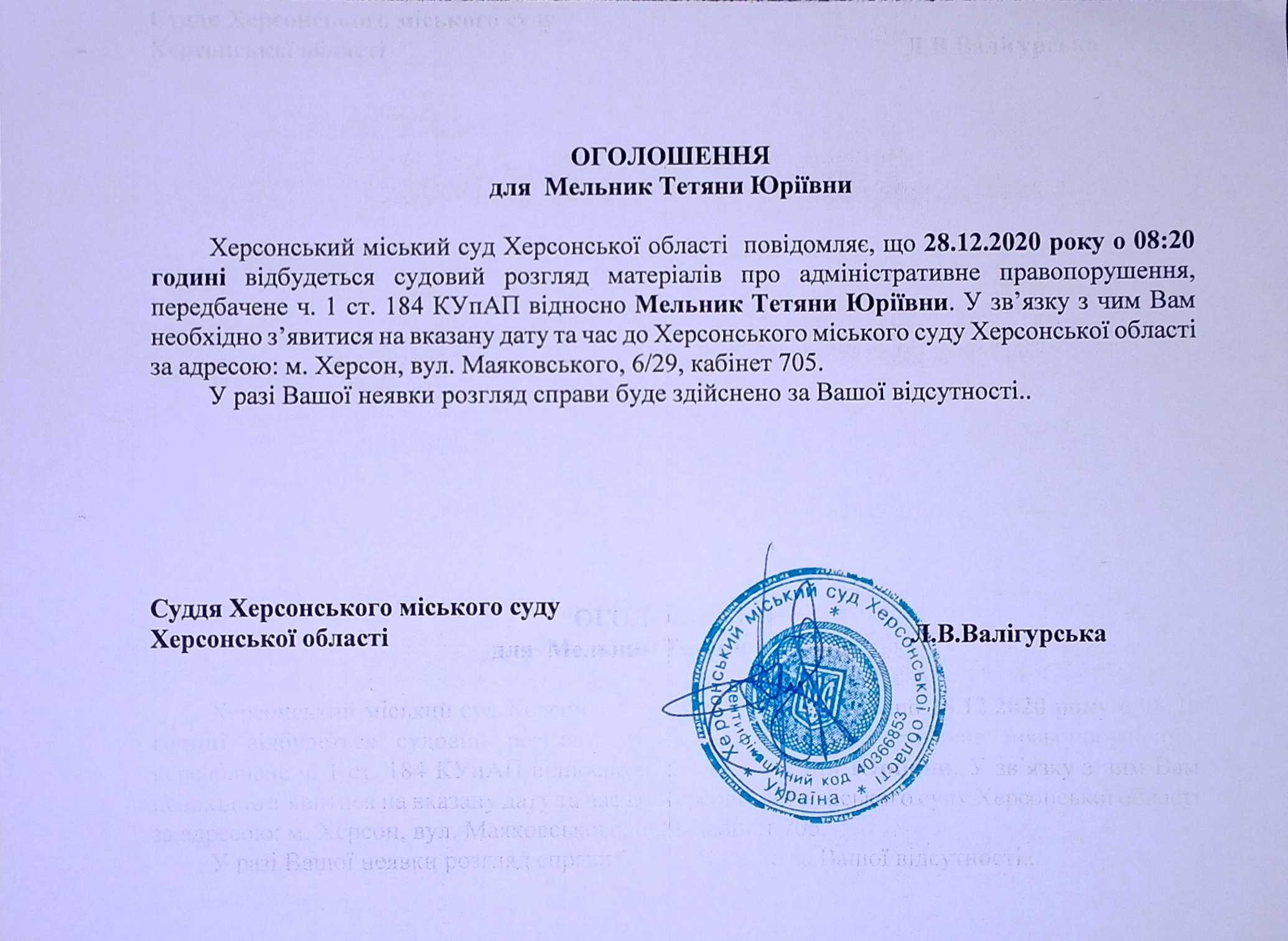 ОГОЛОШЕННЯ для Мельник Тетяни Юріївни