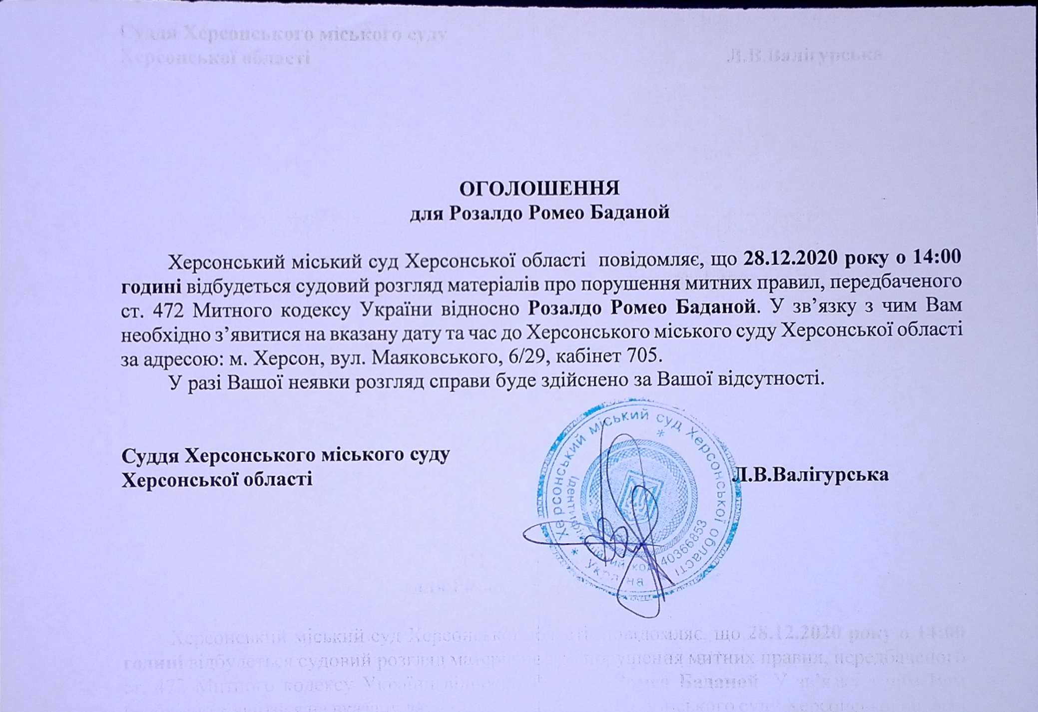 ОГОЛОШЕННЯ ПРО ВИКЛИК ДО СУДУ