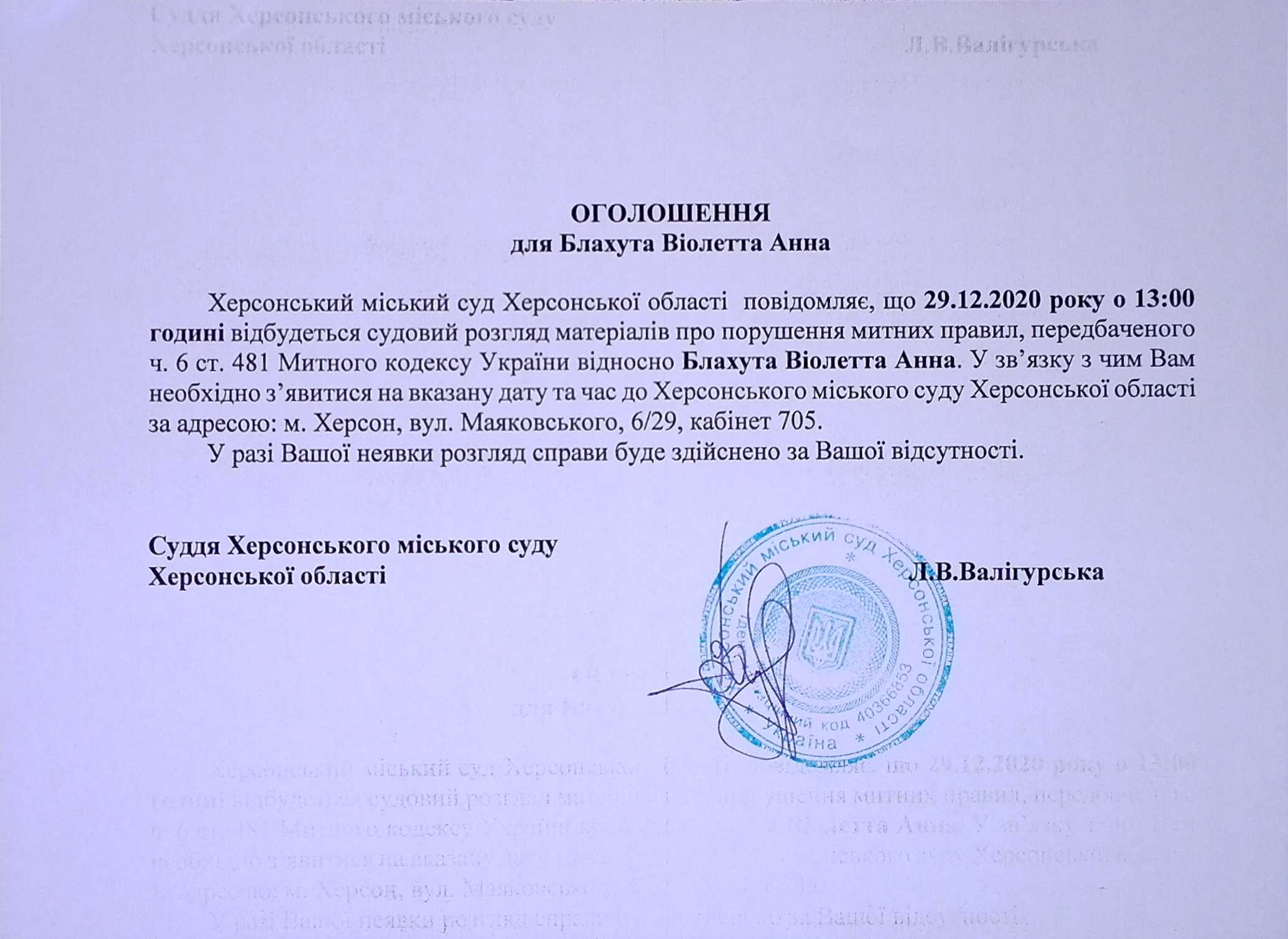 ОГОЛОШЕННЯ для Блахута Віолетта Анна