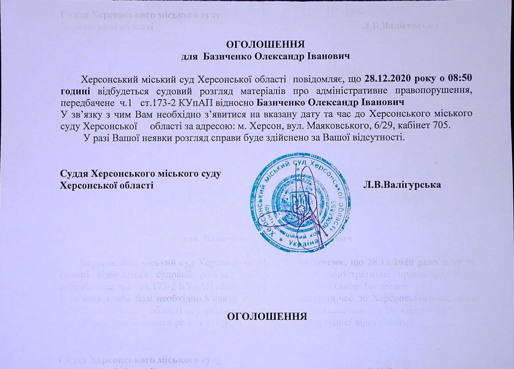 ОГОЛОШЕННЯ для Базиченко Олександра Івановича