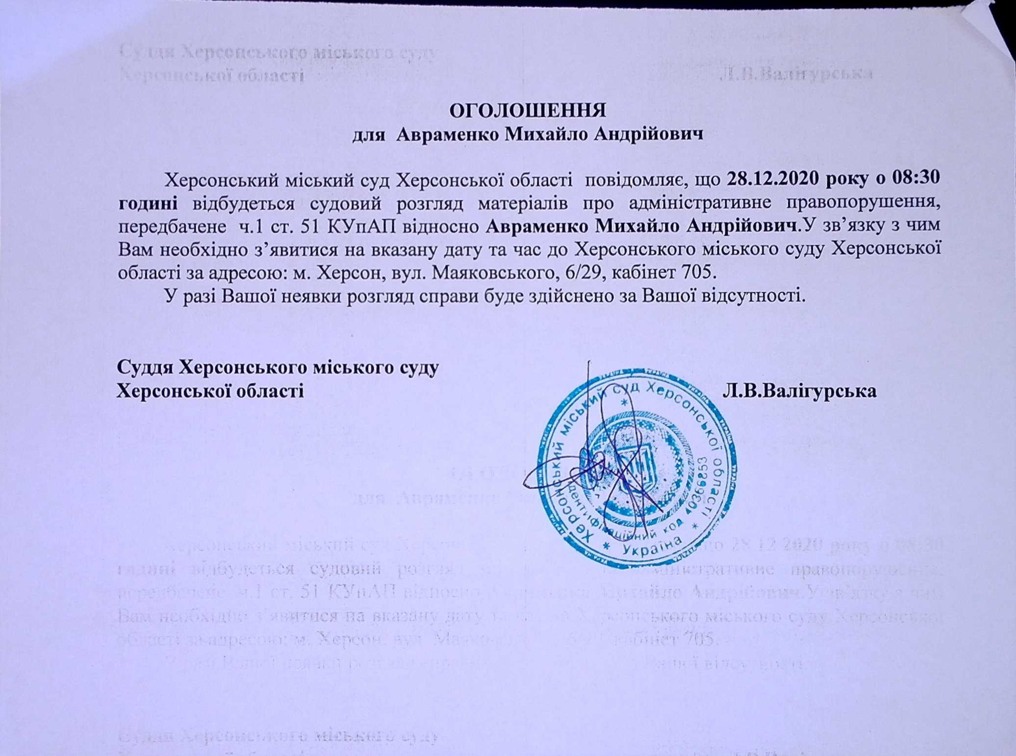 ОГОЛОШЕННЯ ПРО ВИКЛИК ДО СУДУ