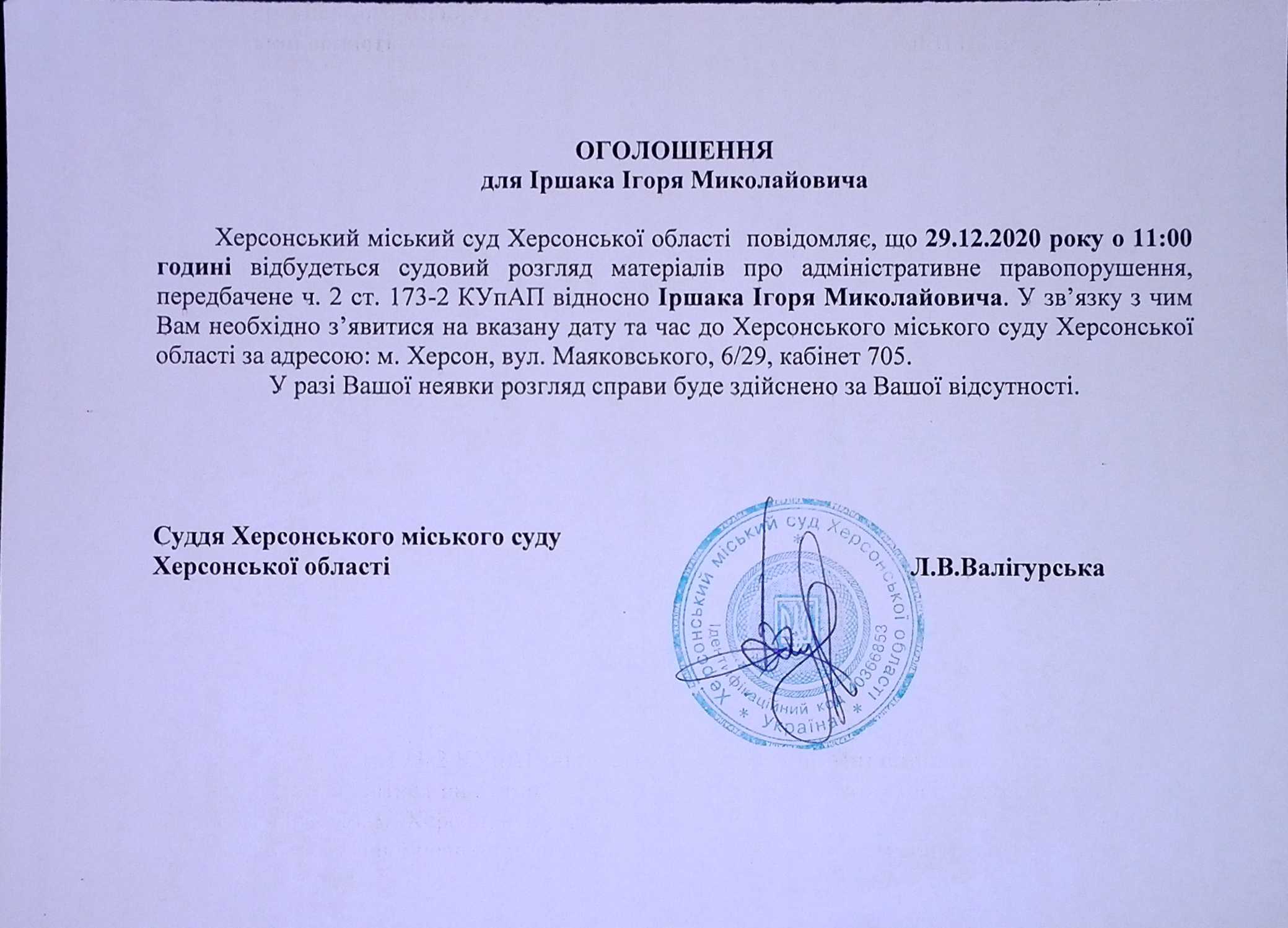 ОГОЛОШЕННЯ ПРО ВИКЛИК ДО СУДУ